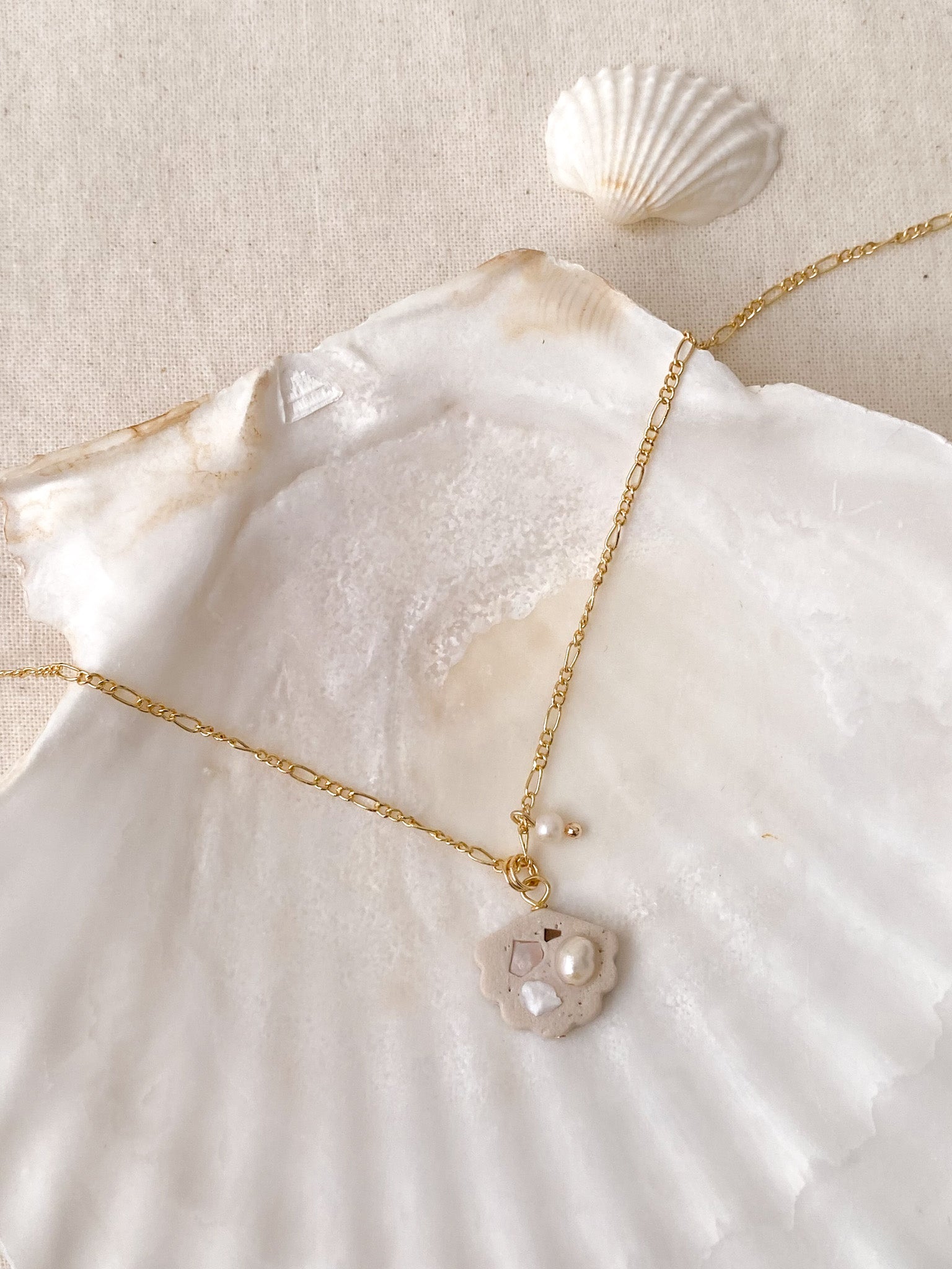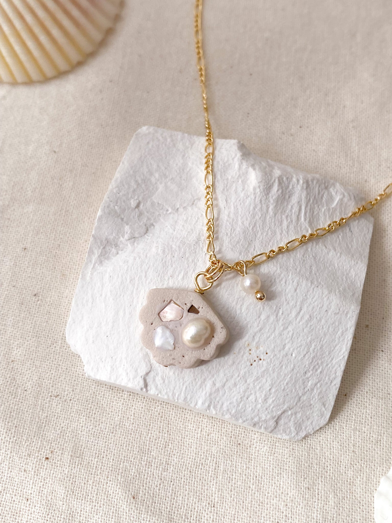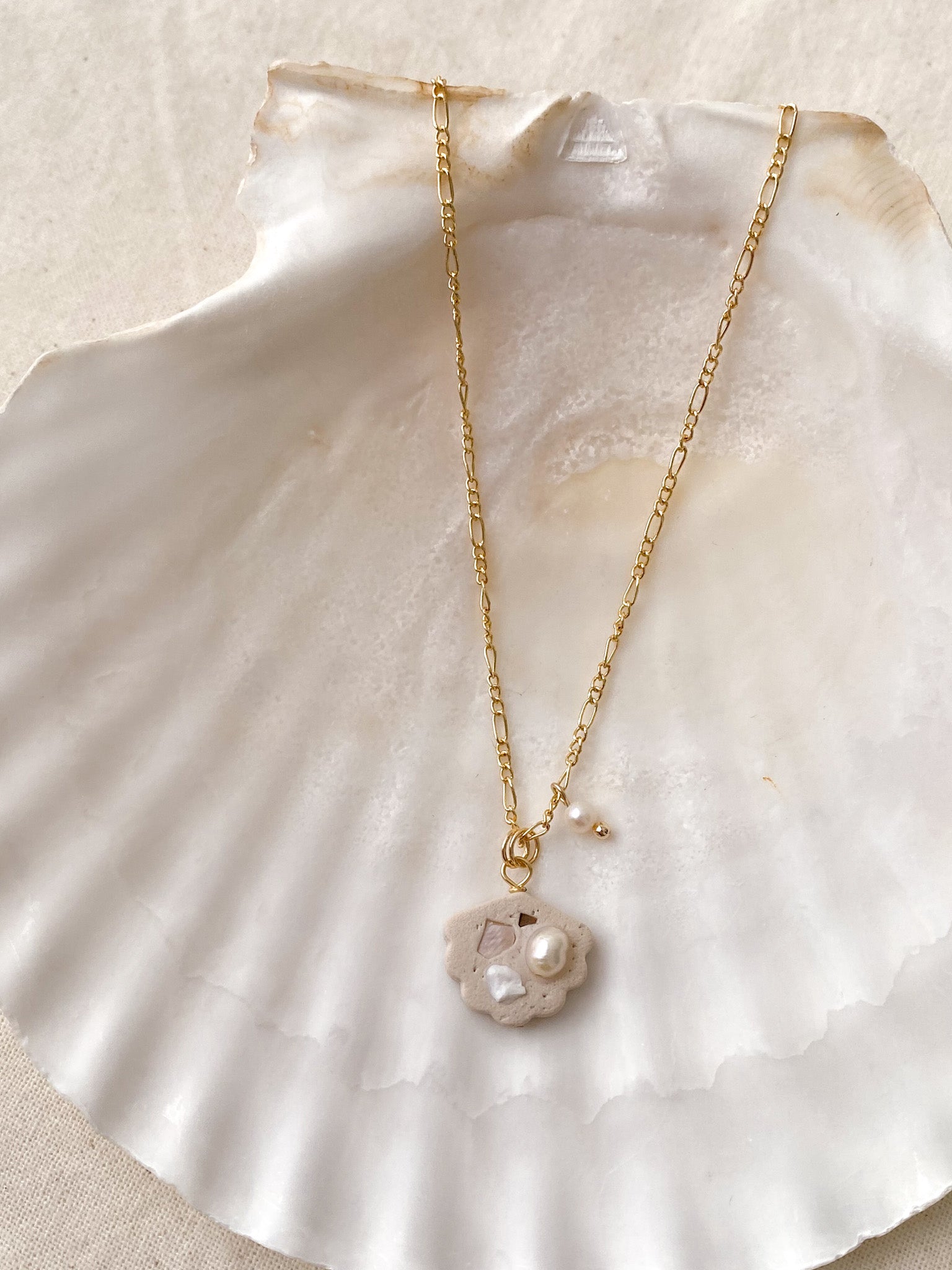 ⋆ Mini freshwater pearls, Polymer Clay Shell Charm(1.5cm Width) & 14K gold plated Figaro copper chain, attached to lobster clasp
