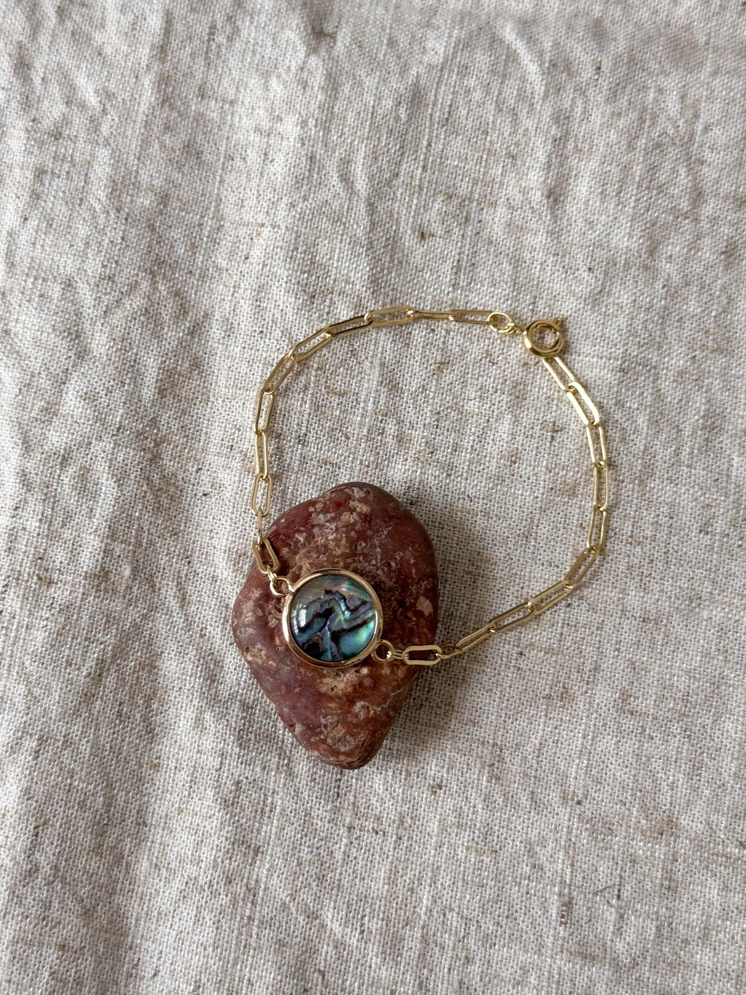 Material: natural abalone/mother of pearl charm, 14k Gold Plated Chain, attached to spring ring clasp