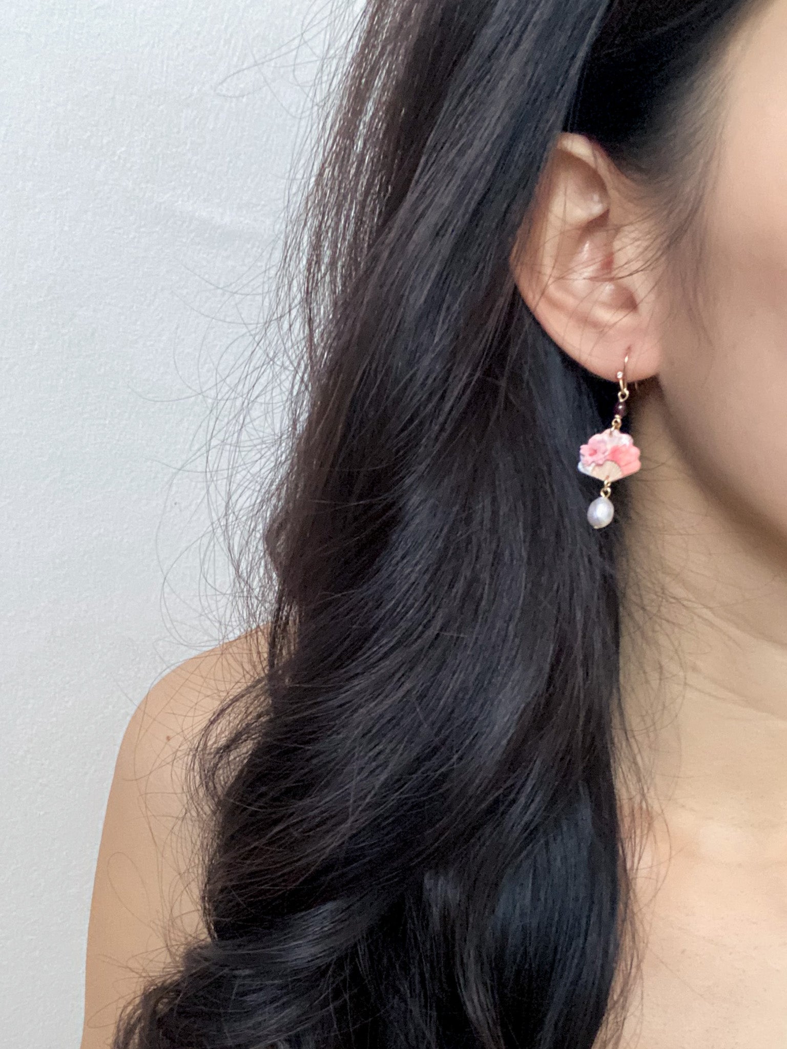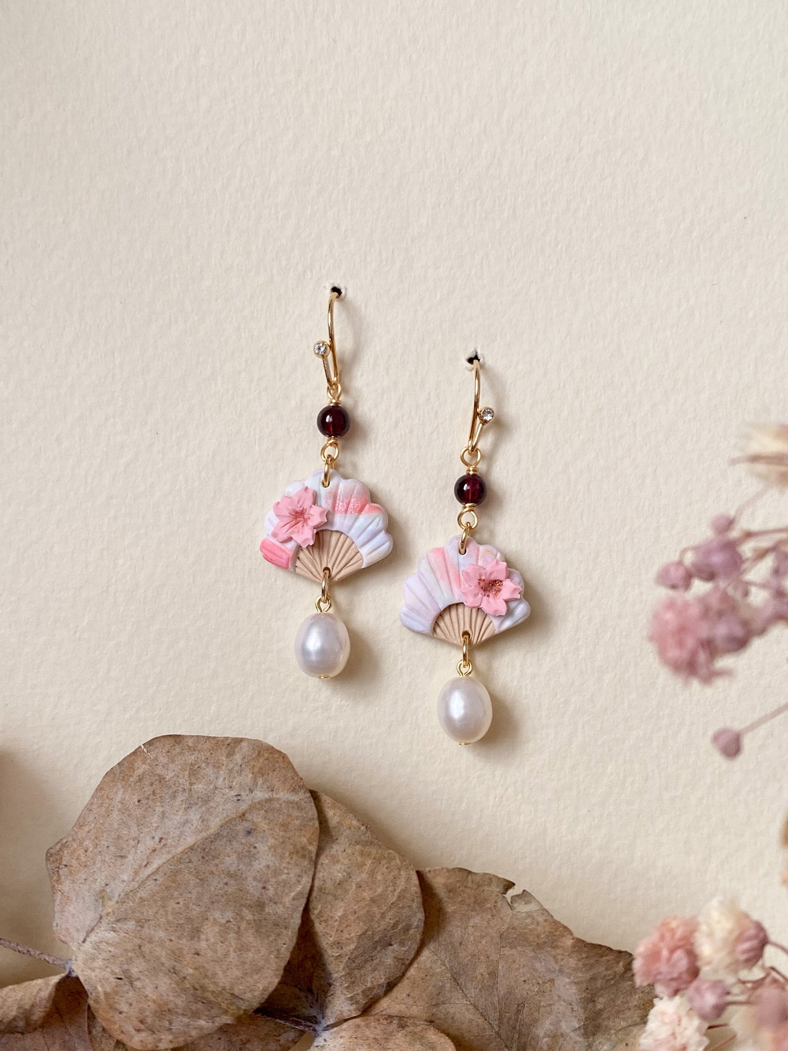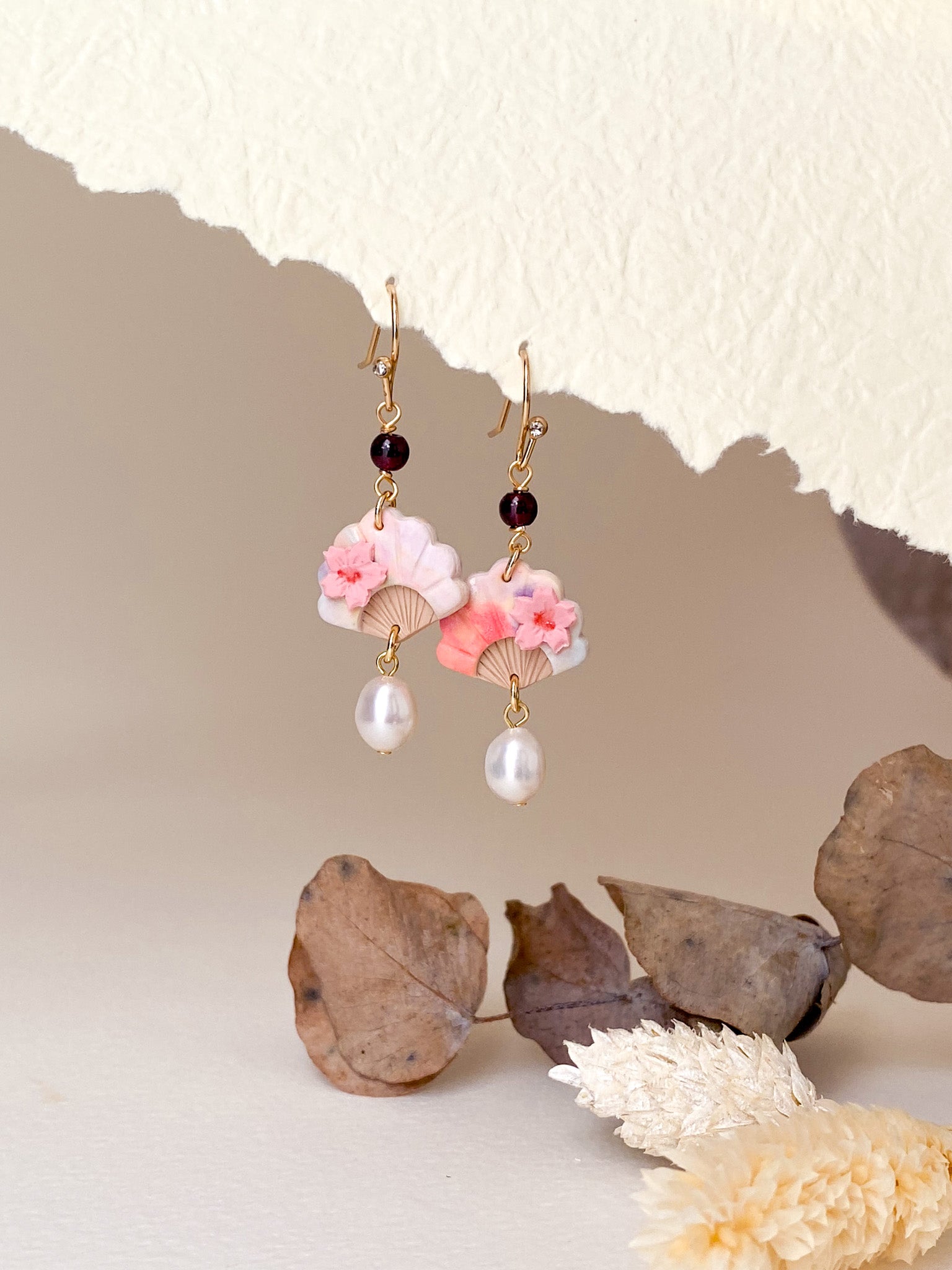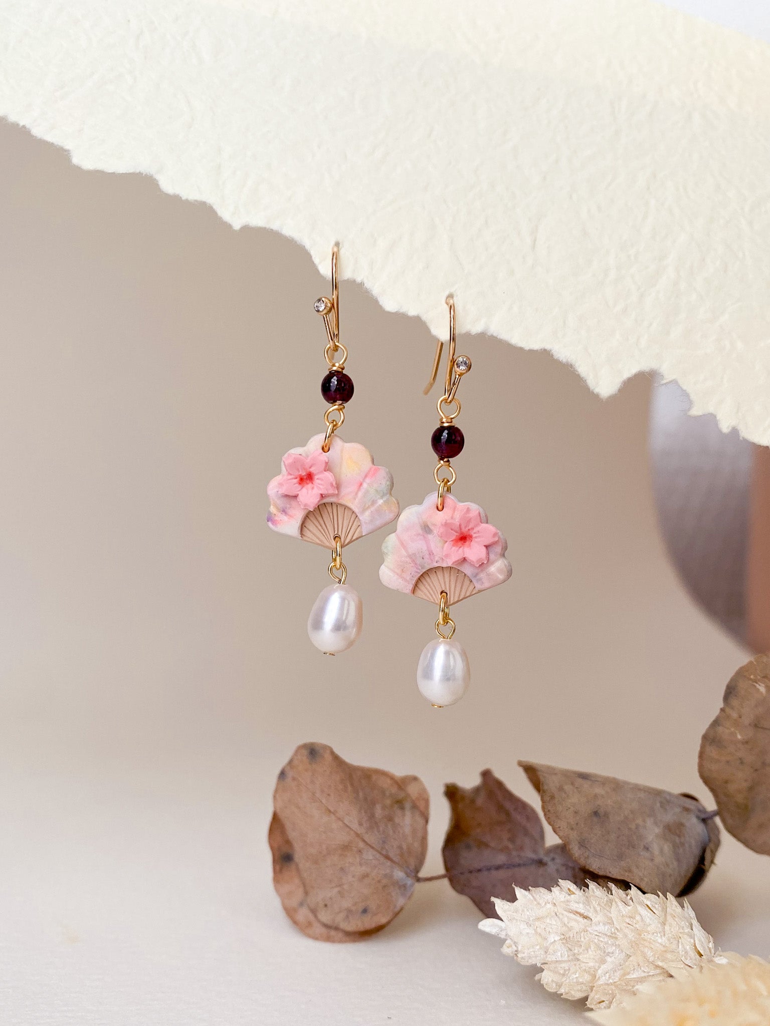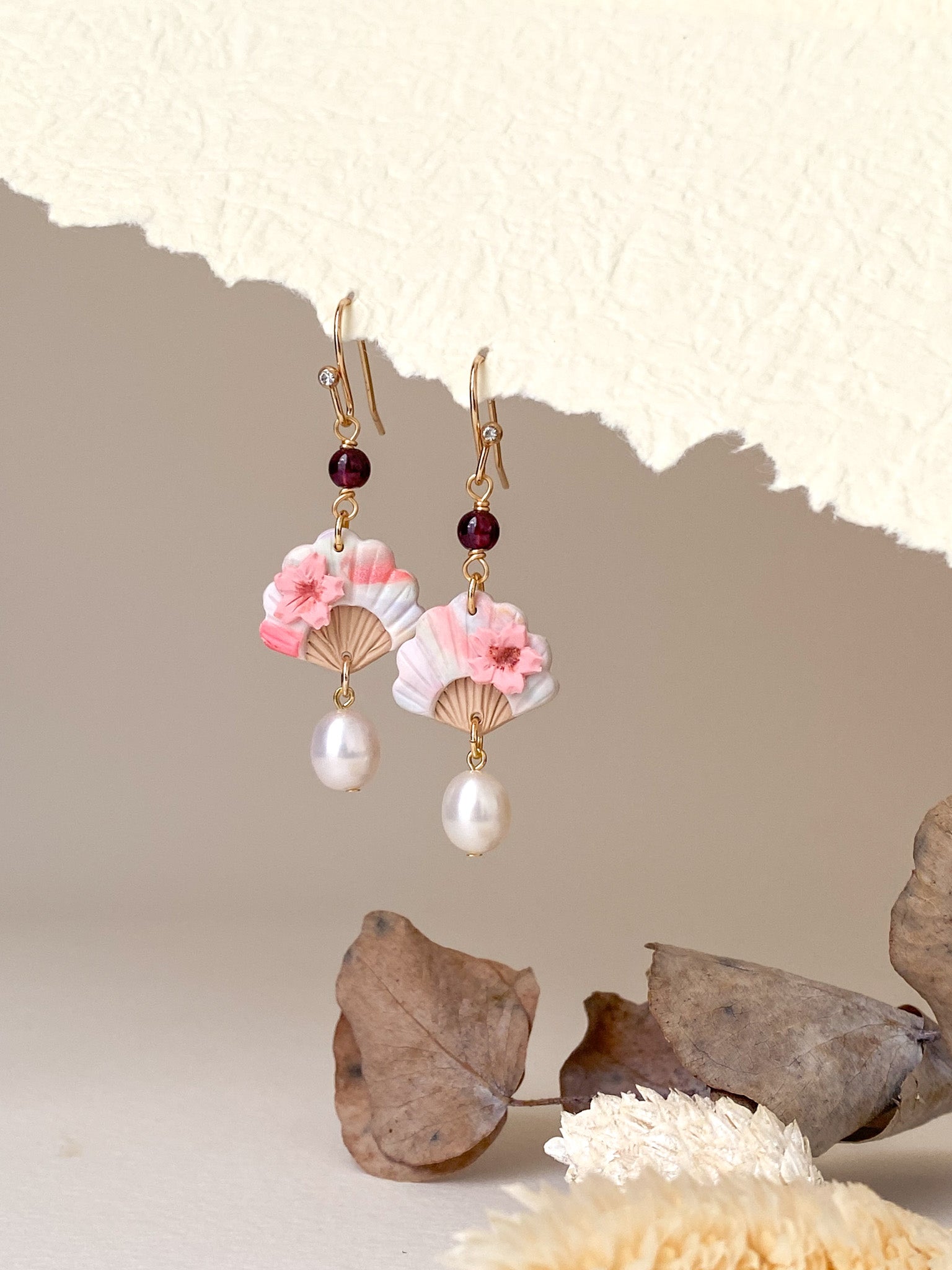 Aka - Mini Fan Earrings with Garnet & Pearl