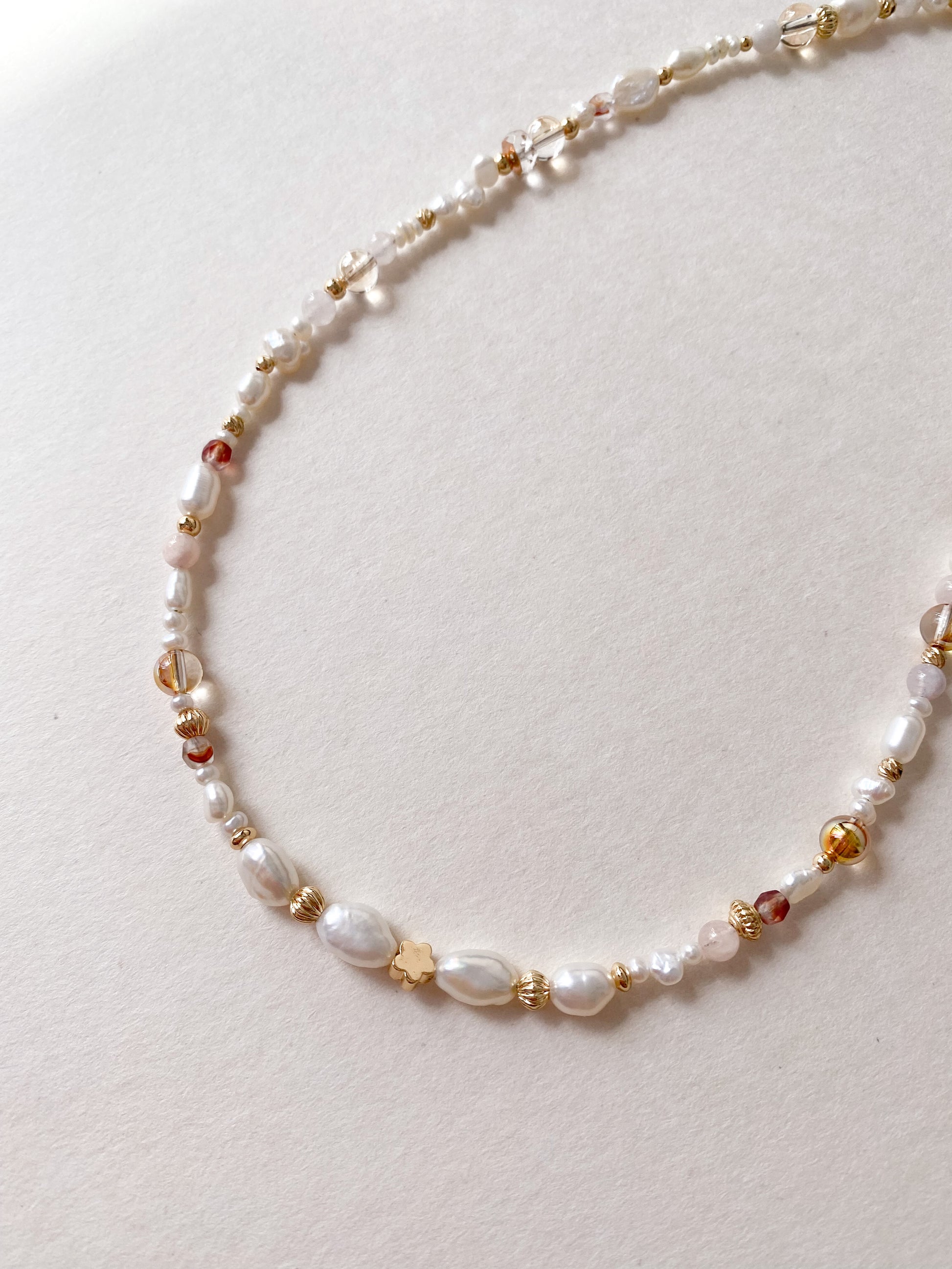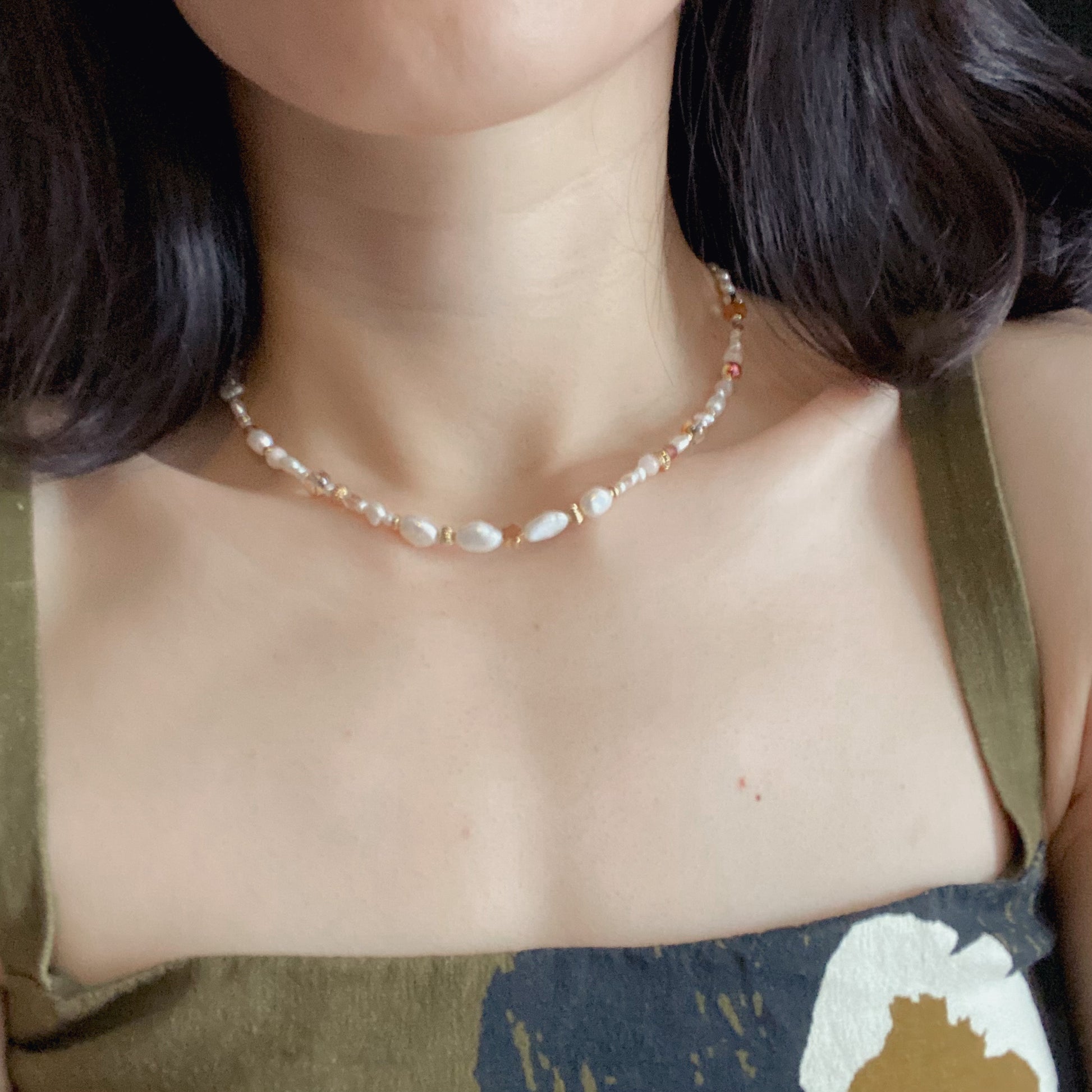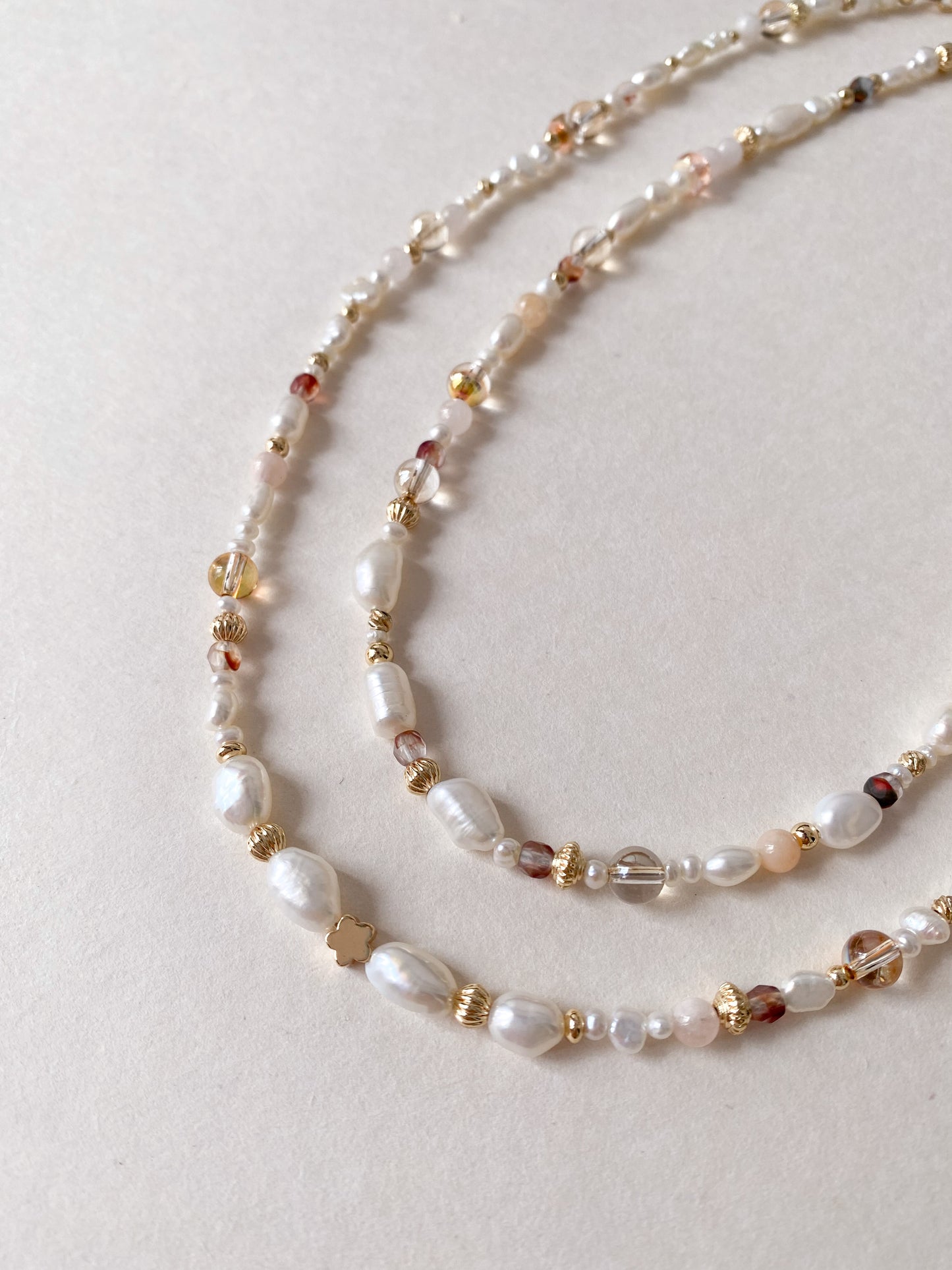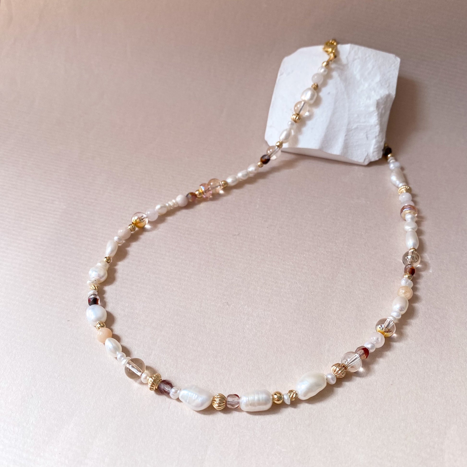 ⋆ Genuine freshwater pearls, natural morganite beads, Swarovski beads, Czech beads and 14K gold plated materials