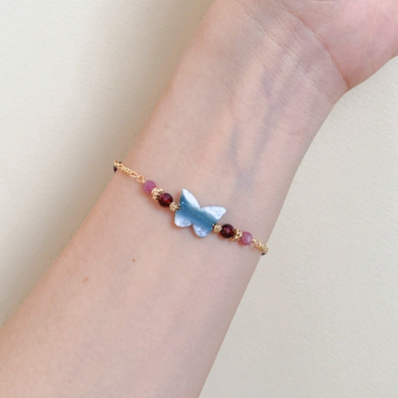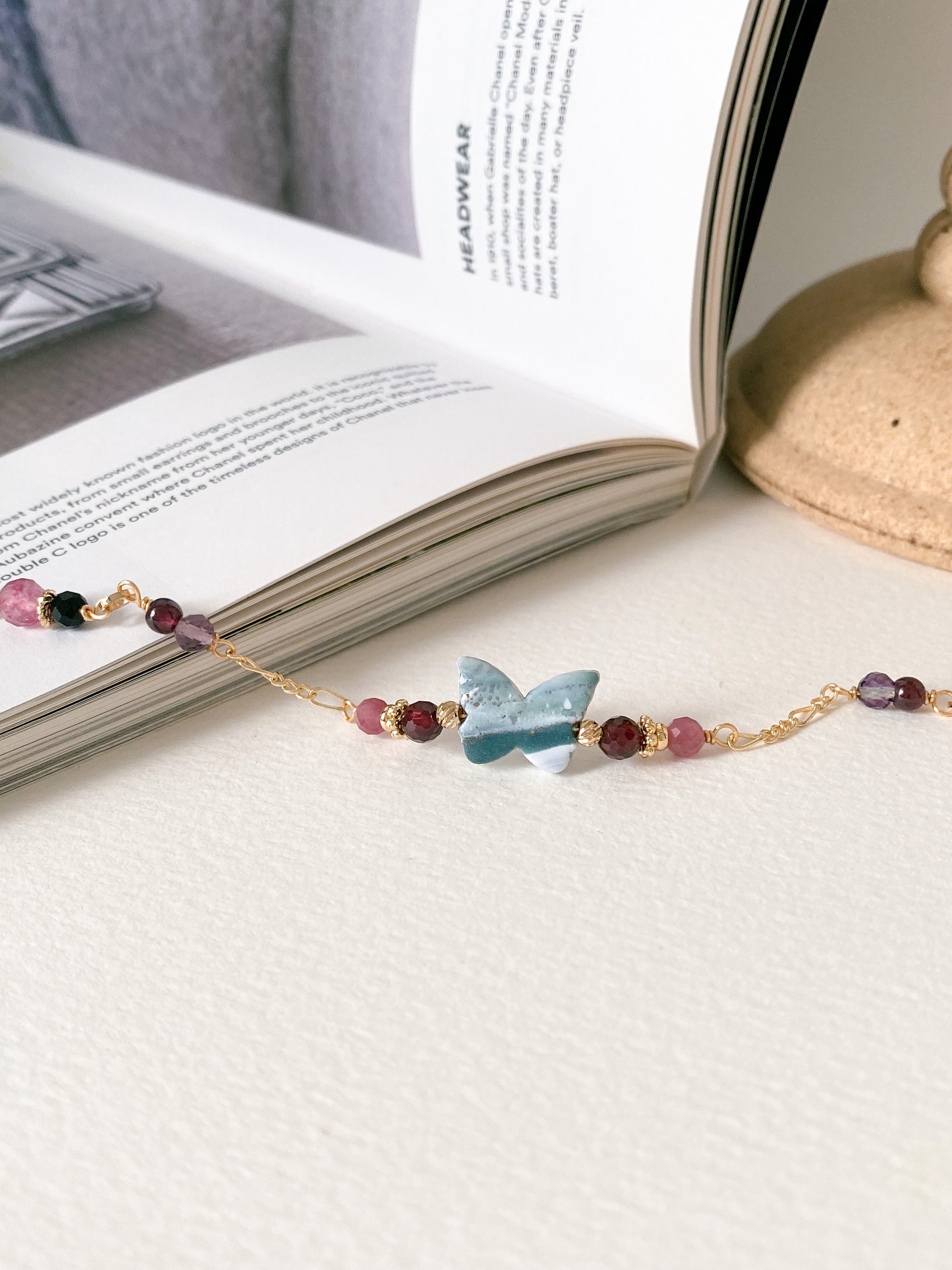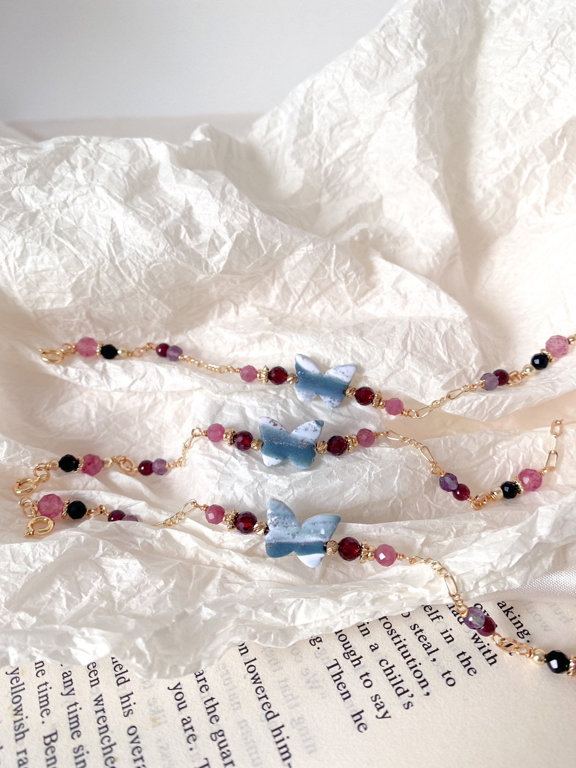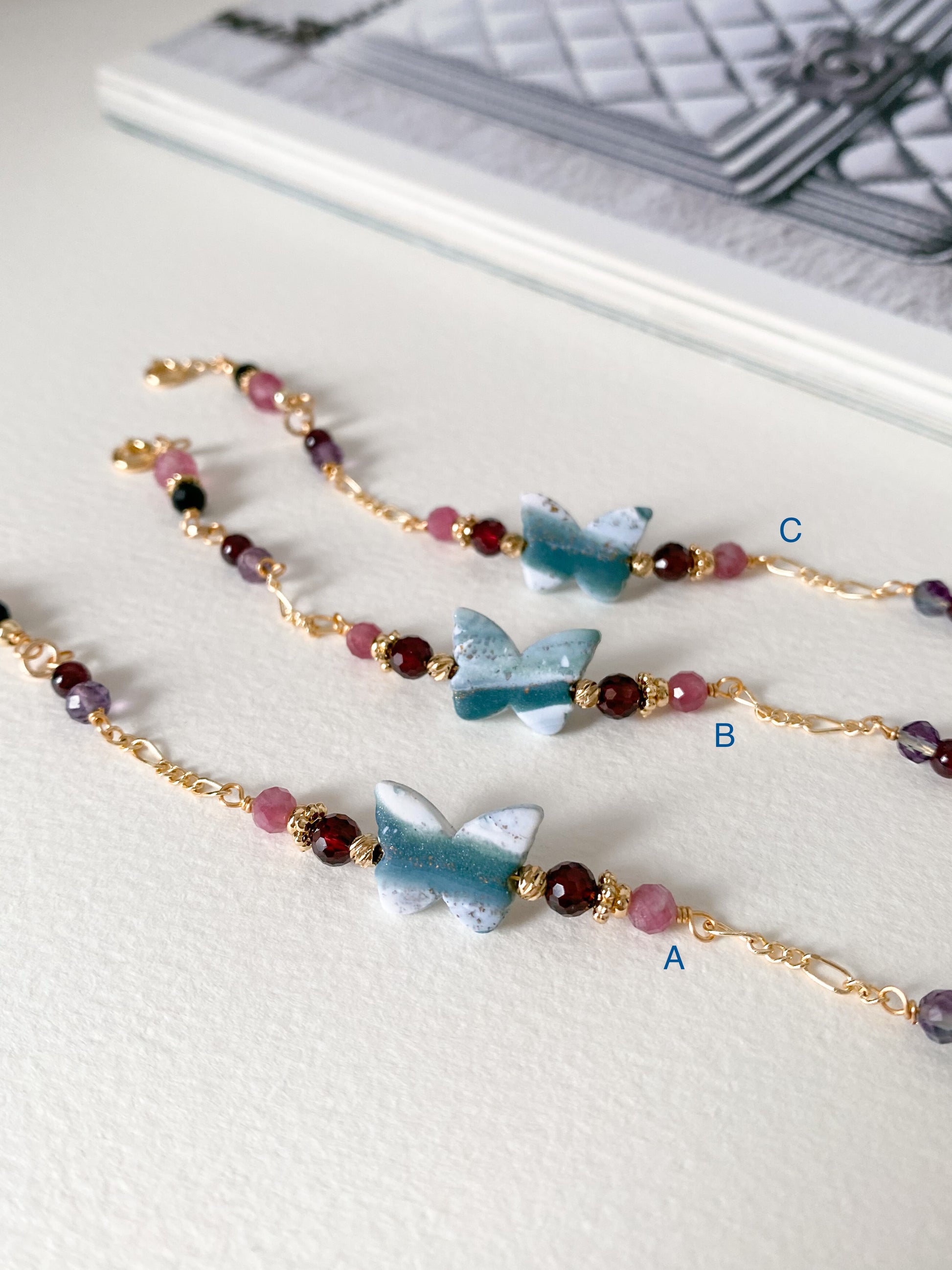 Material : Polymer clay butterfly charm, natural gemstones and 14k Gold Plated Chain, attached to spring ring clasp