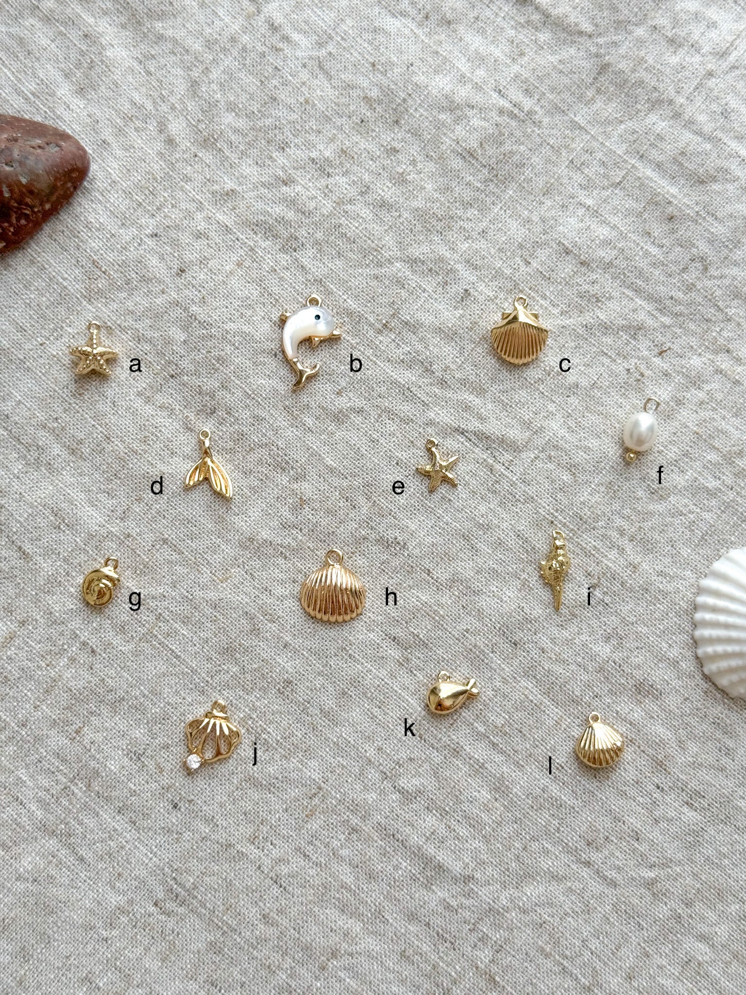 14k gold plated chain and charms, mother of pearl, pearl