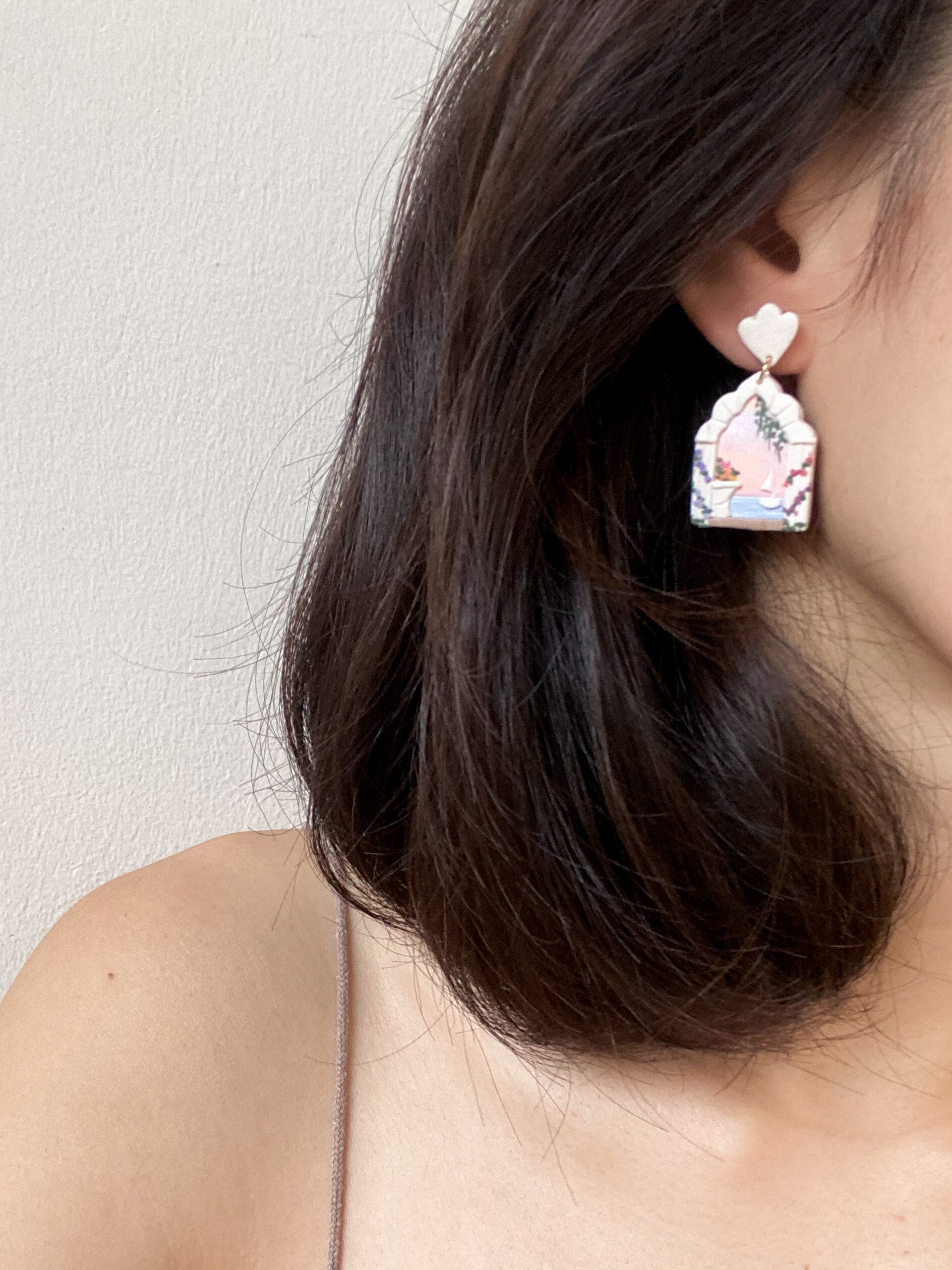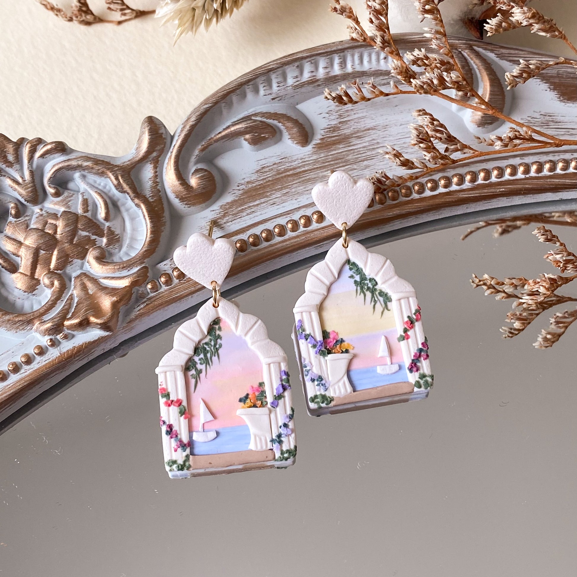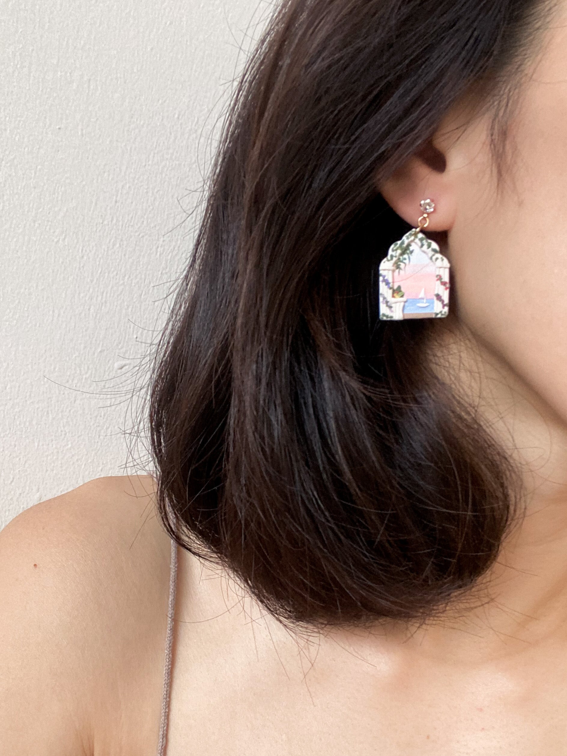 Crafted with a shade of sunset and greek inspired architecture, these earrings will add some delightful whimsy to your wardrobe, allowing you to access a land of dreams.