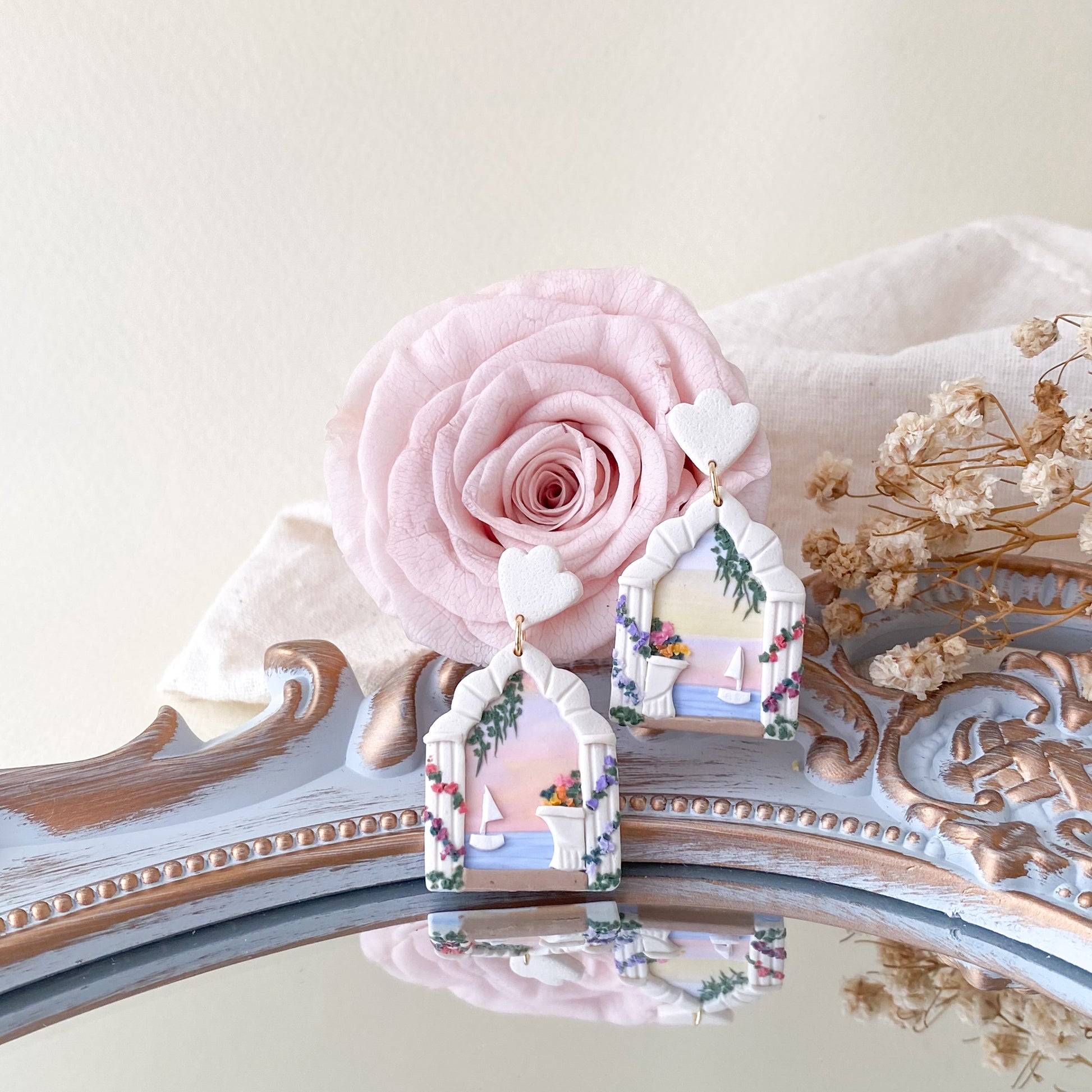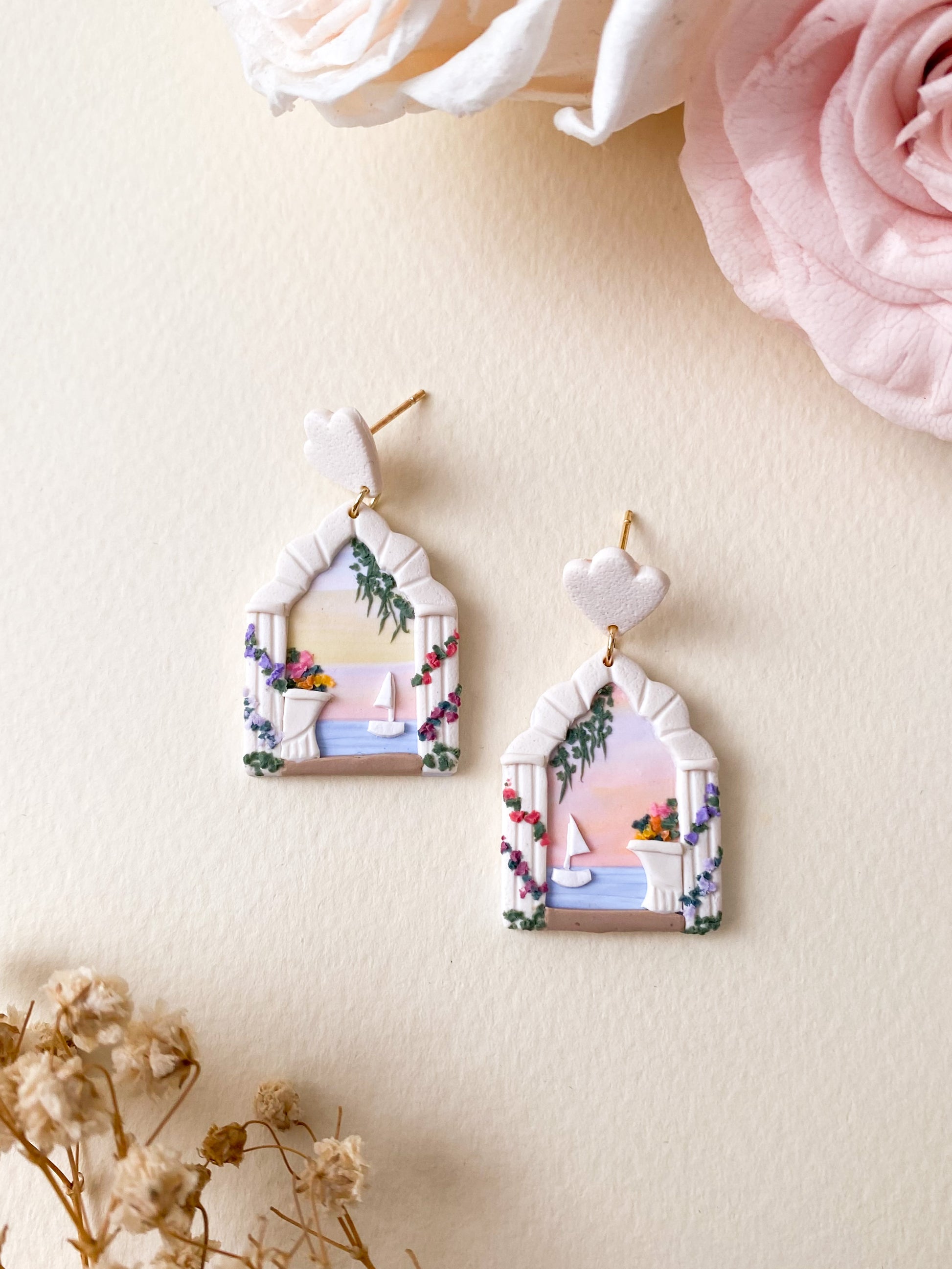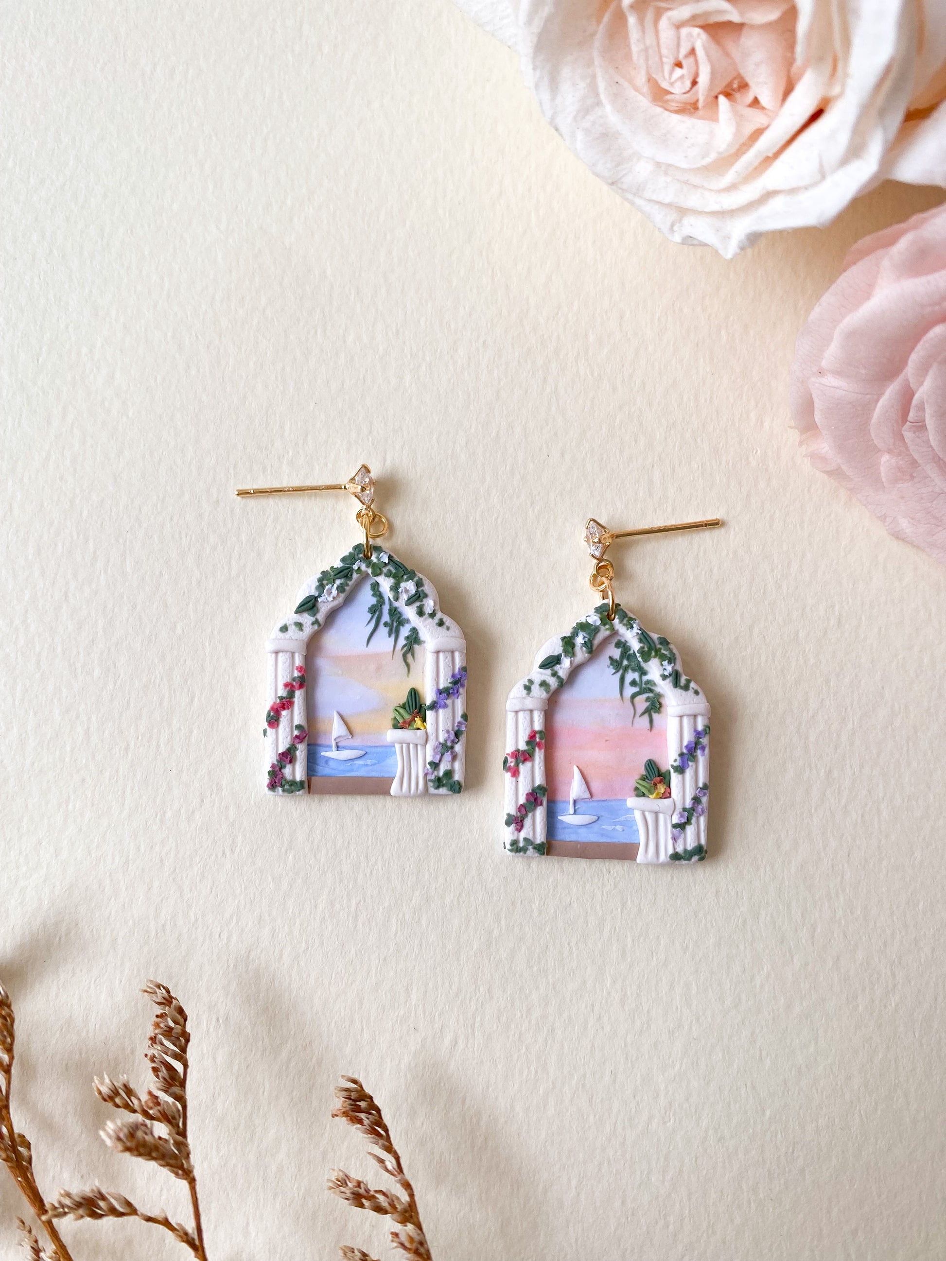 Crafted with a shade of sunset and greek inspired architecture, these earrings will add some delightful whimsy to your wardrobe, allowing you to access a land of dreams.
