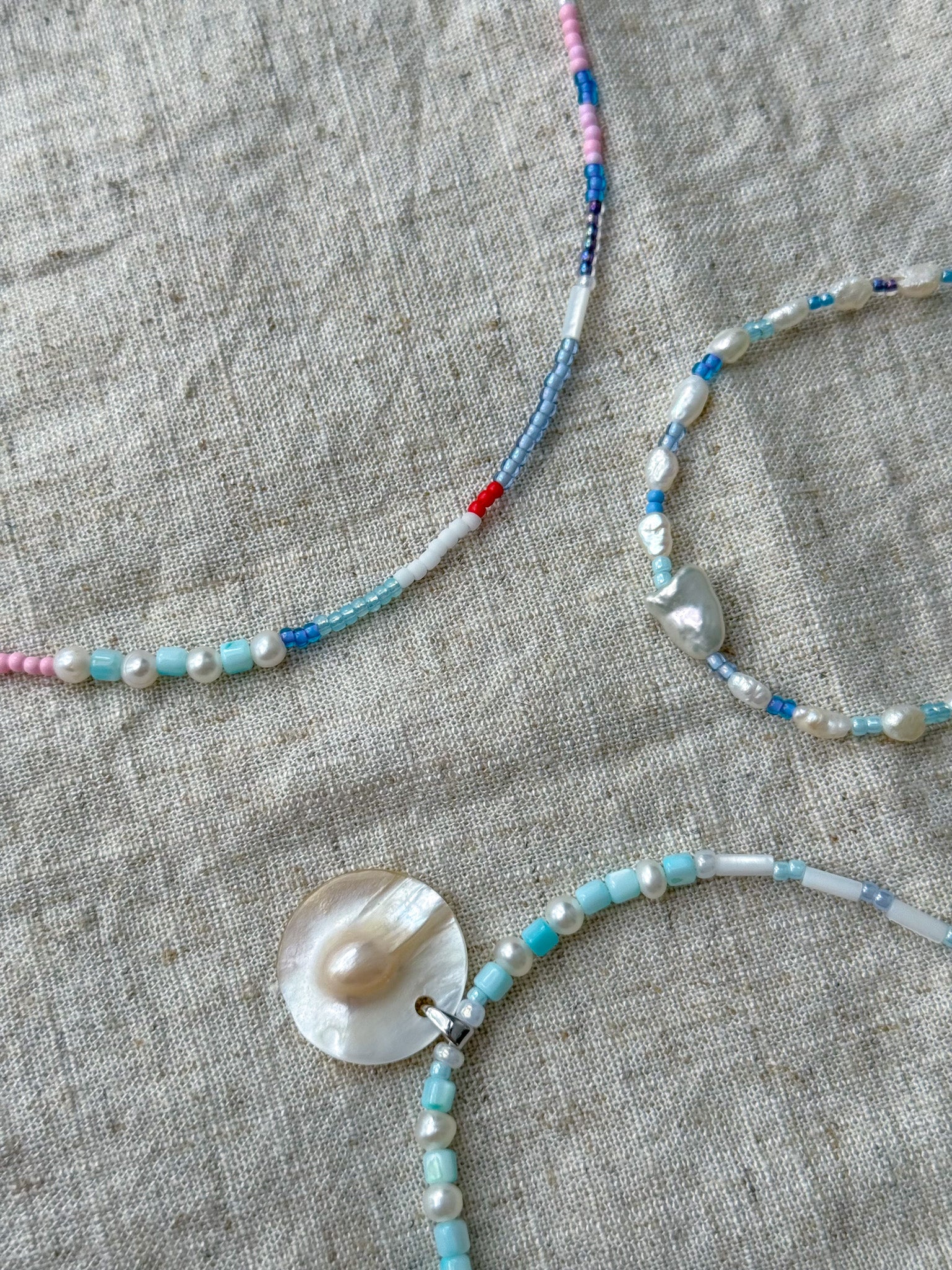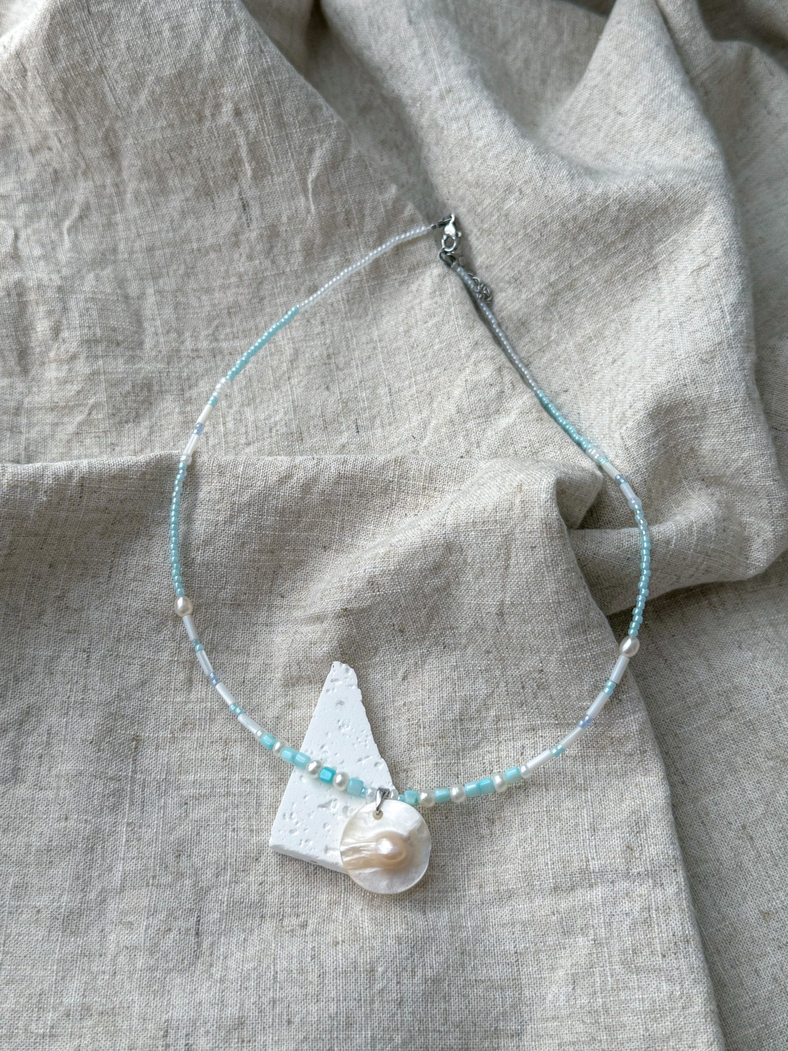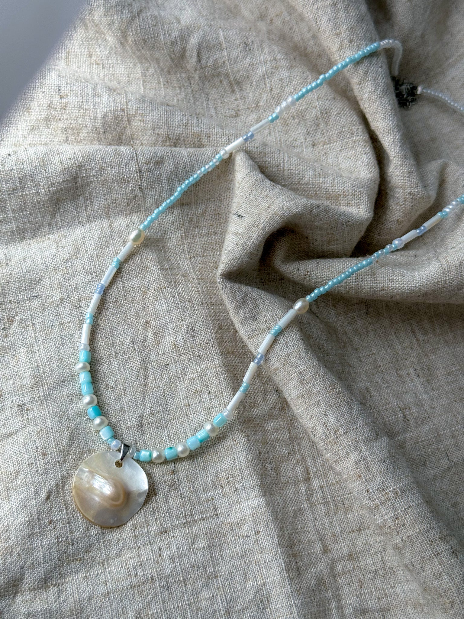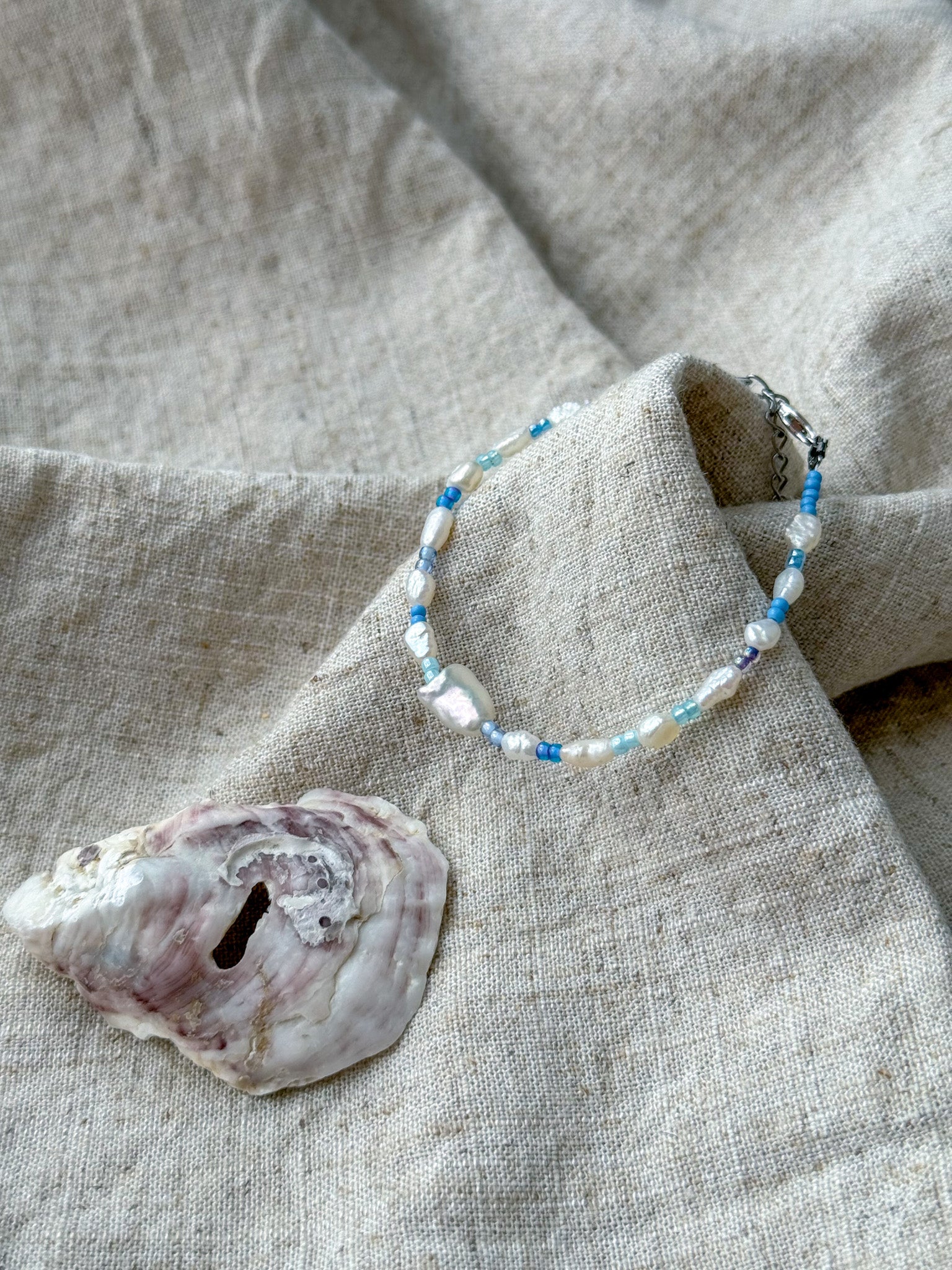 Material: natural shell beads, freshwater pearl and glass seed beads, attached to stainless steel lobster clasp