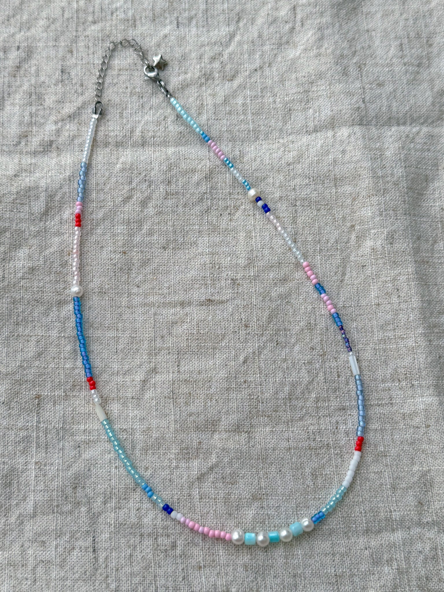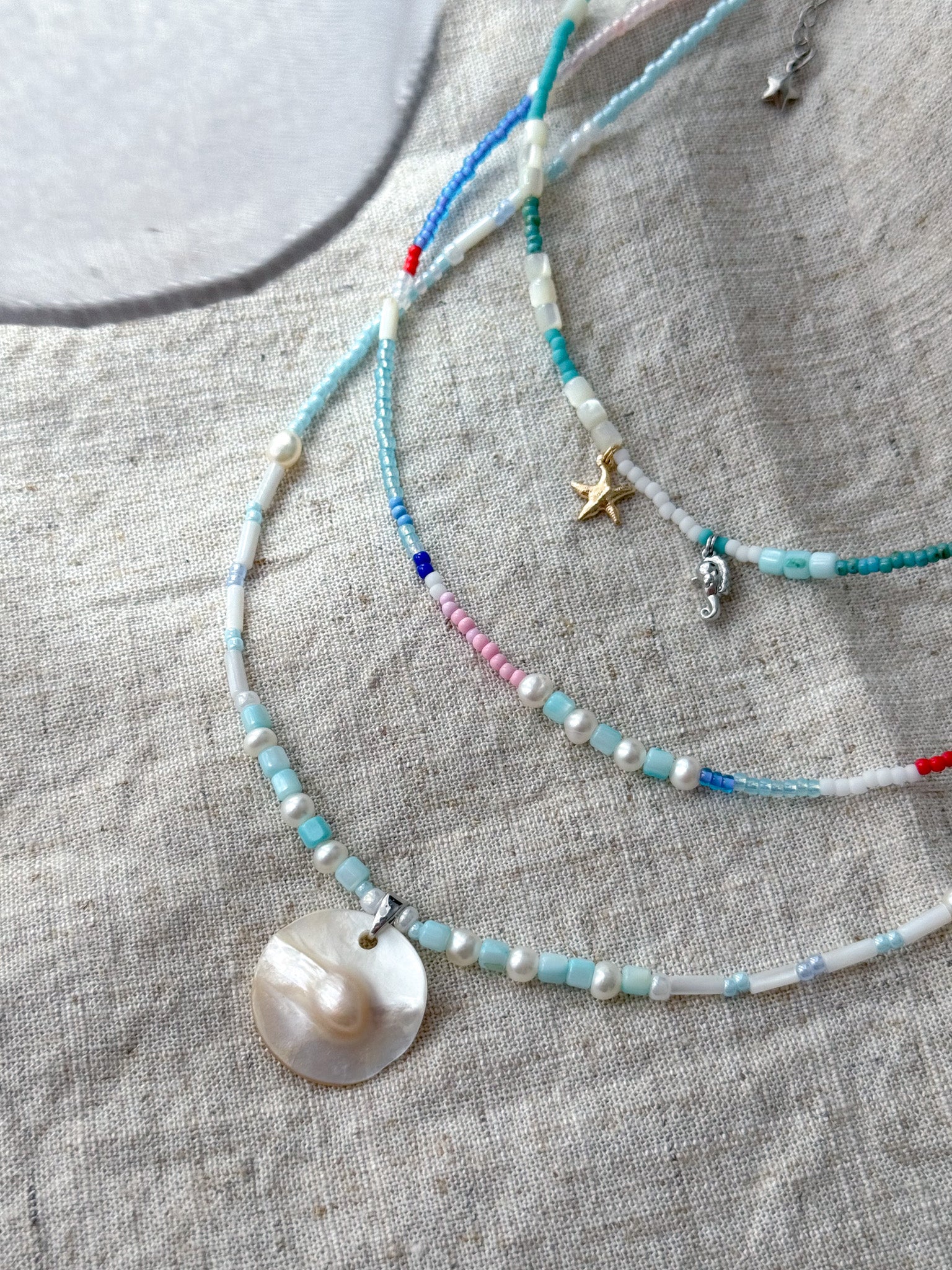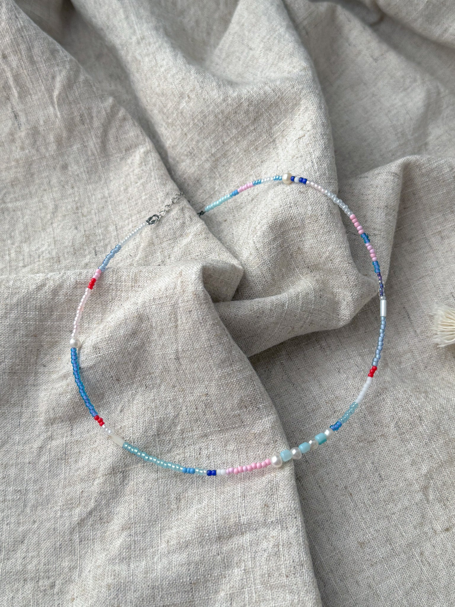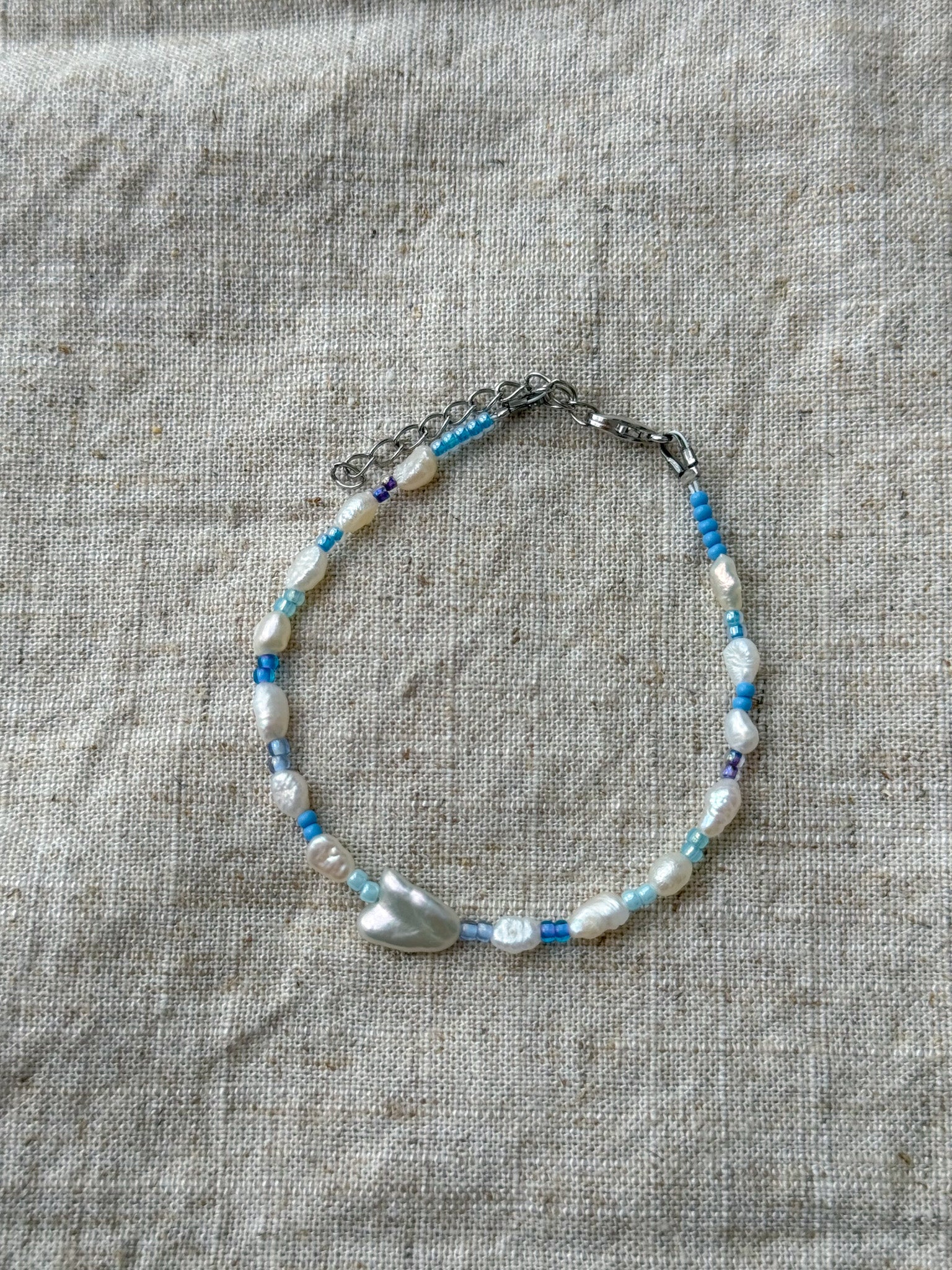 Material: natural shell beads, freshwater pearl and glass seed beads, attached to stainless steel lobster clasp