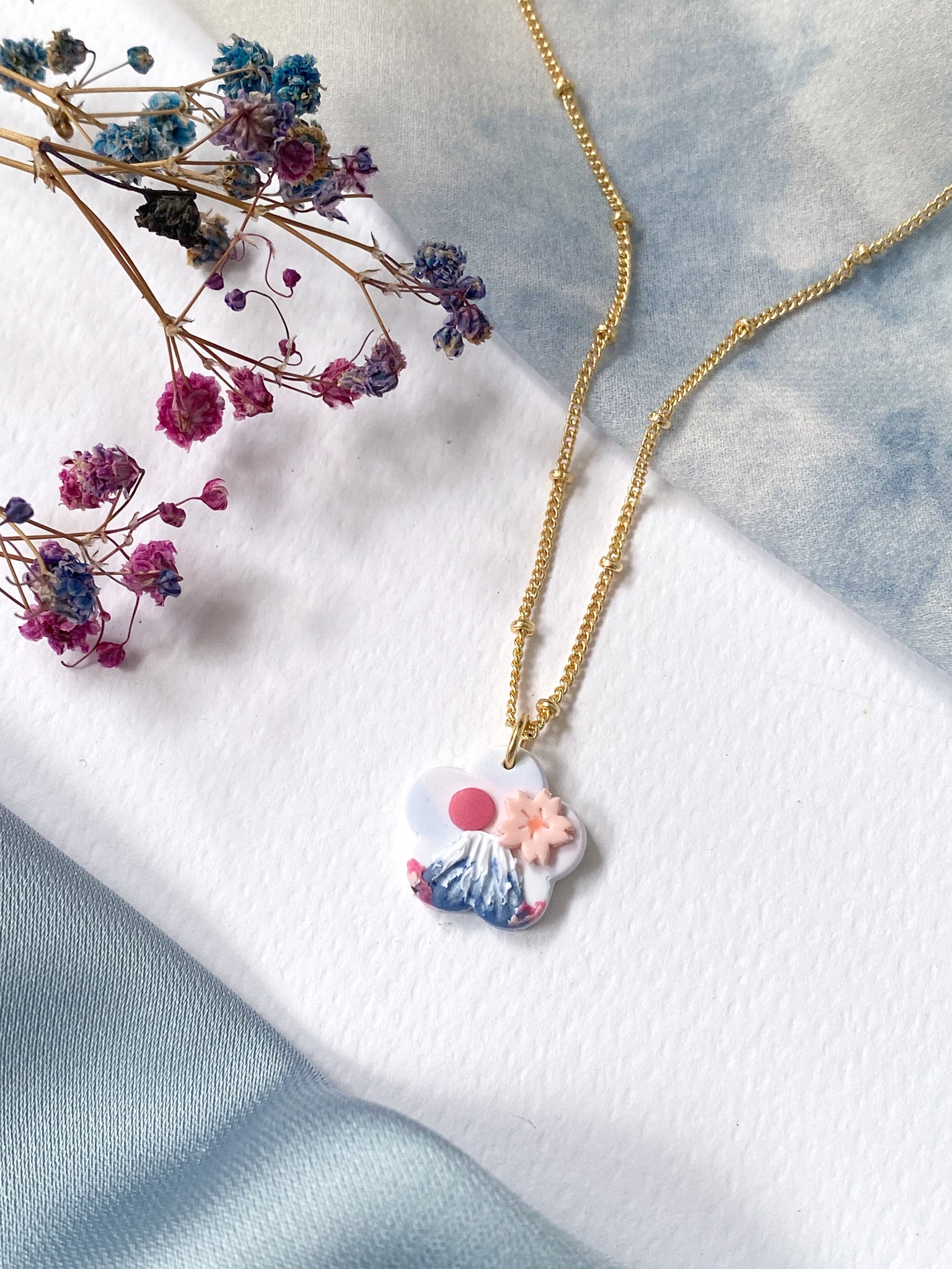 The pendant crafted with the iconic image of Fujisan and cherry blossom. The sophistication and simplicity design captures the beauty of the Land of the Rising Sun. Perfect as a gift or a special treat.