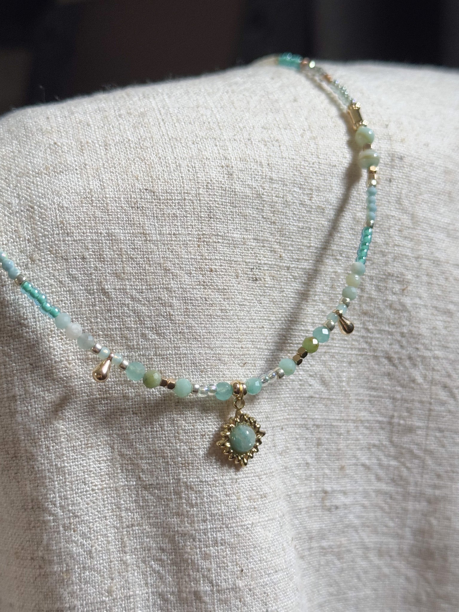 Materials: Natural amazonite, premium Japanese glass beads, and 18k gold-plated/stainless steel parts.