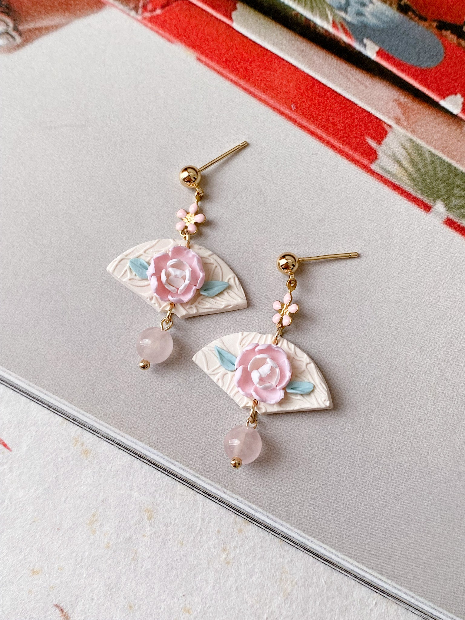 ⋆ Made from polymer clay, natural rose quartz and 14k gold plated studs