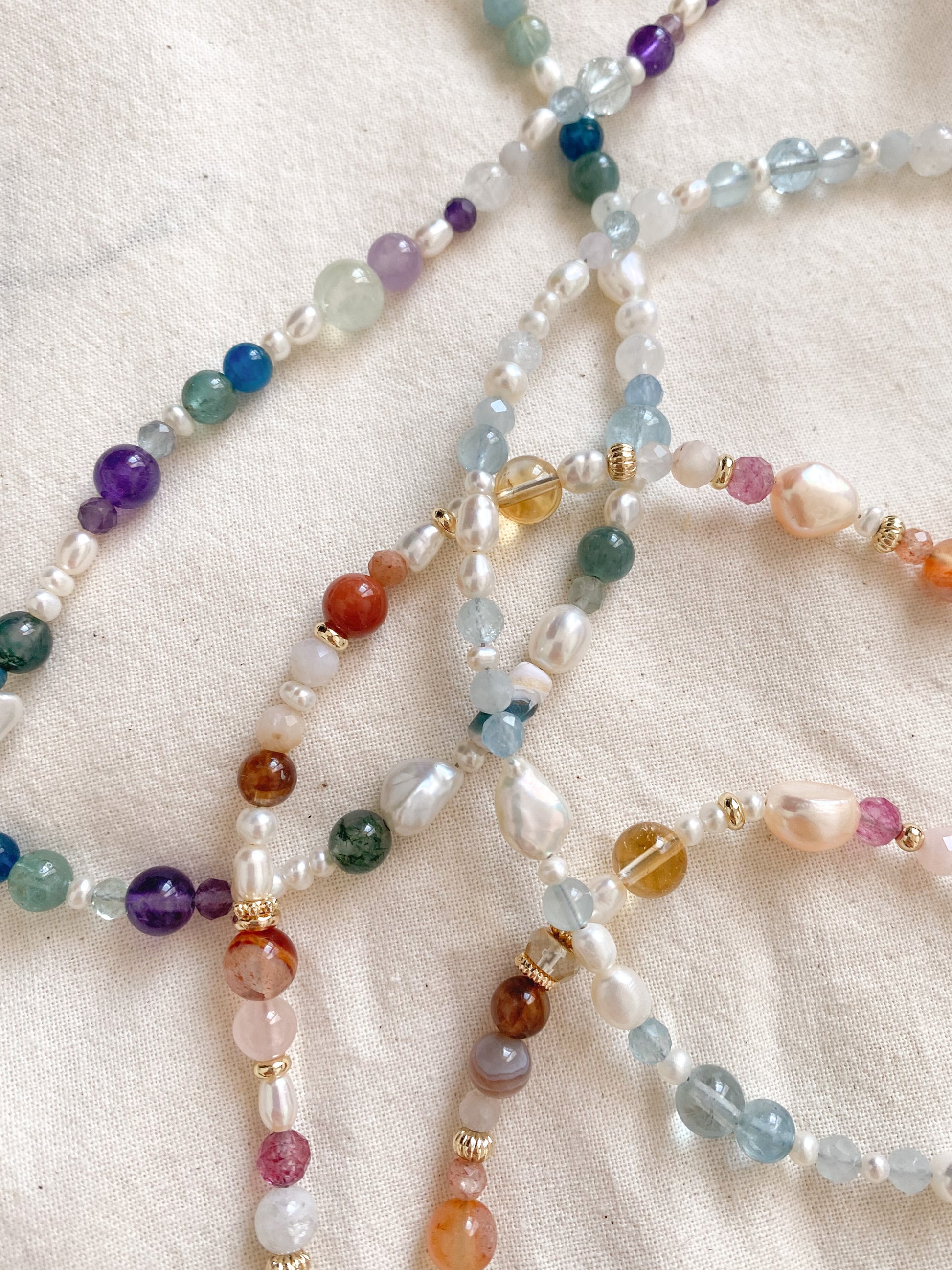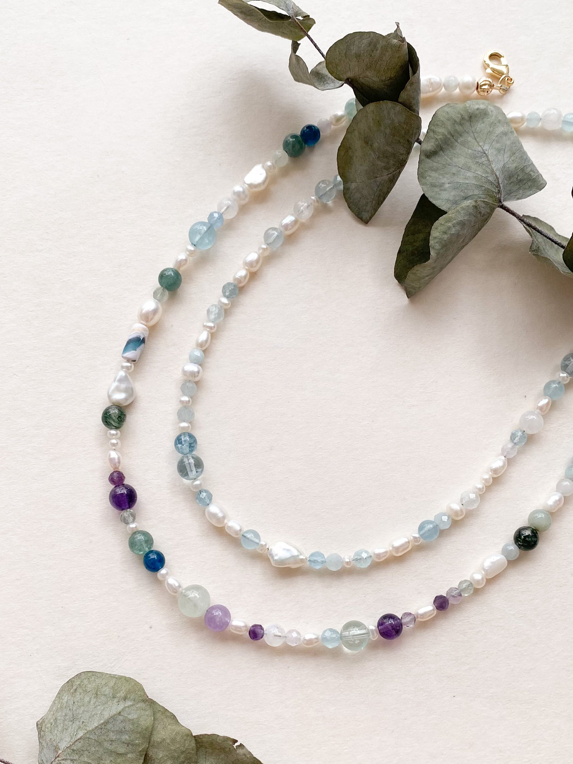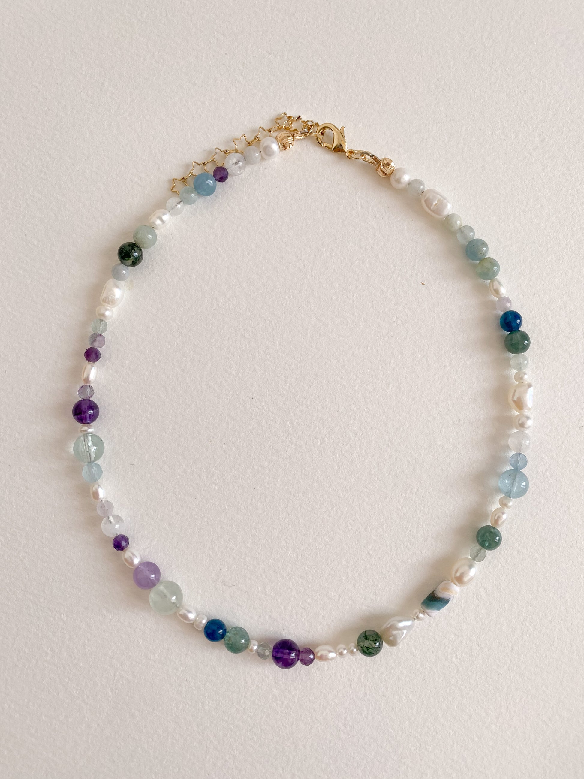Style D: Natural Amethyst, Lavender Amethyst, Aquamarine, Fluorite, Apatite, Prehnite, Moss Agate, Moonstone and freshwater pearls
