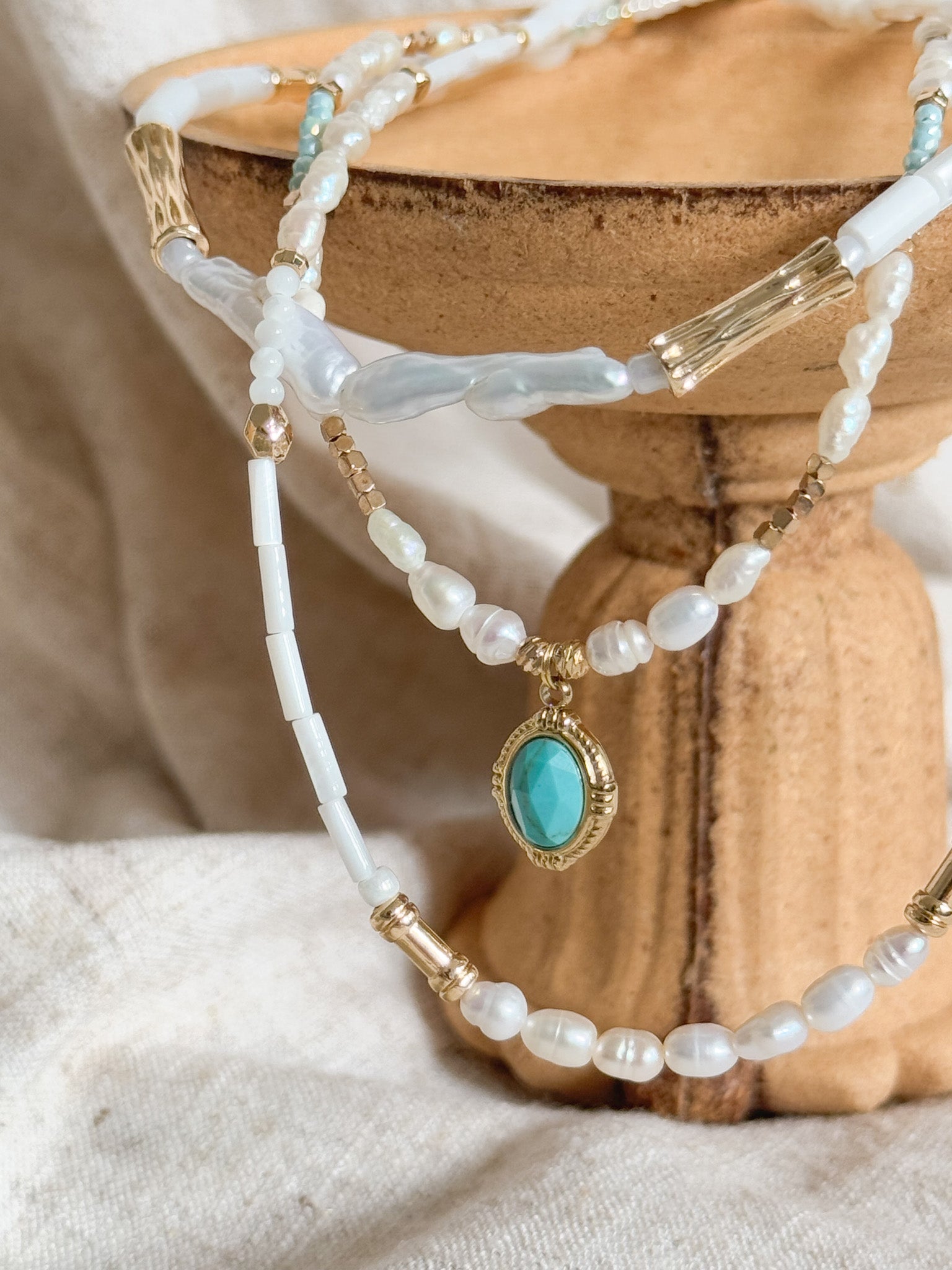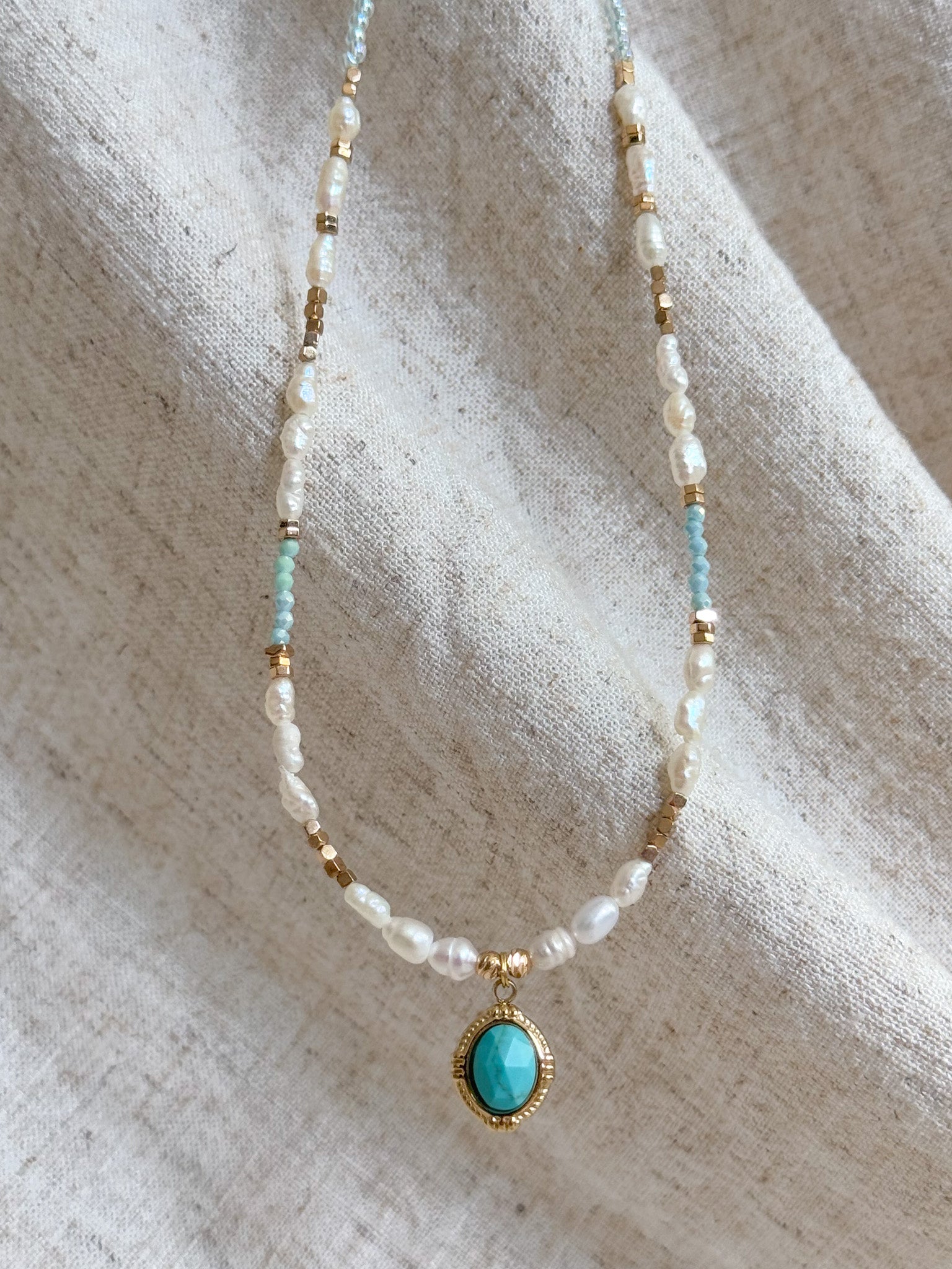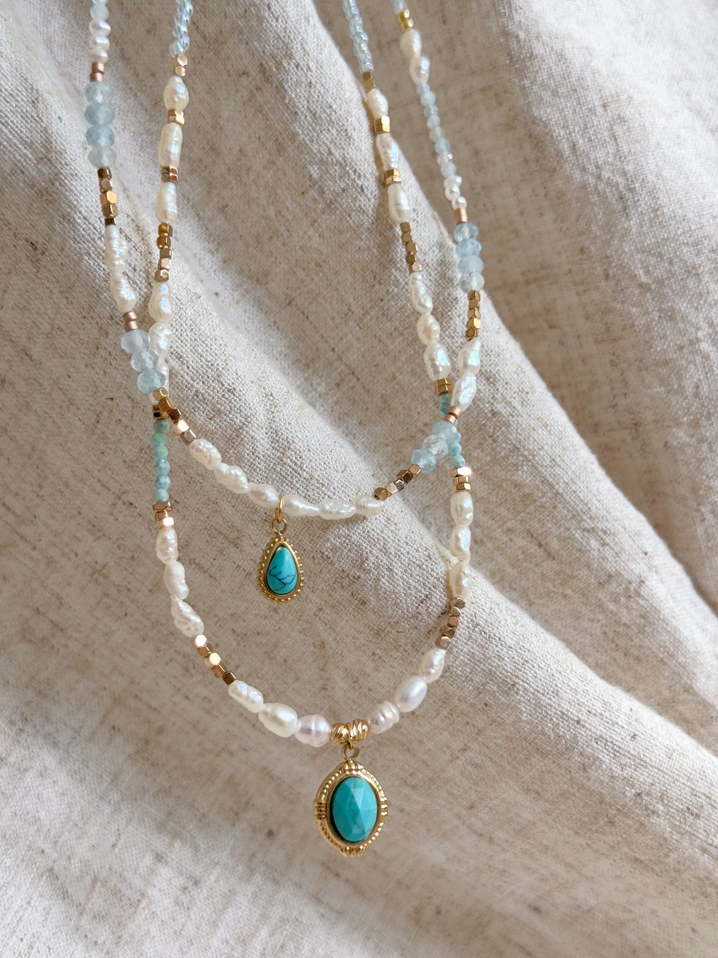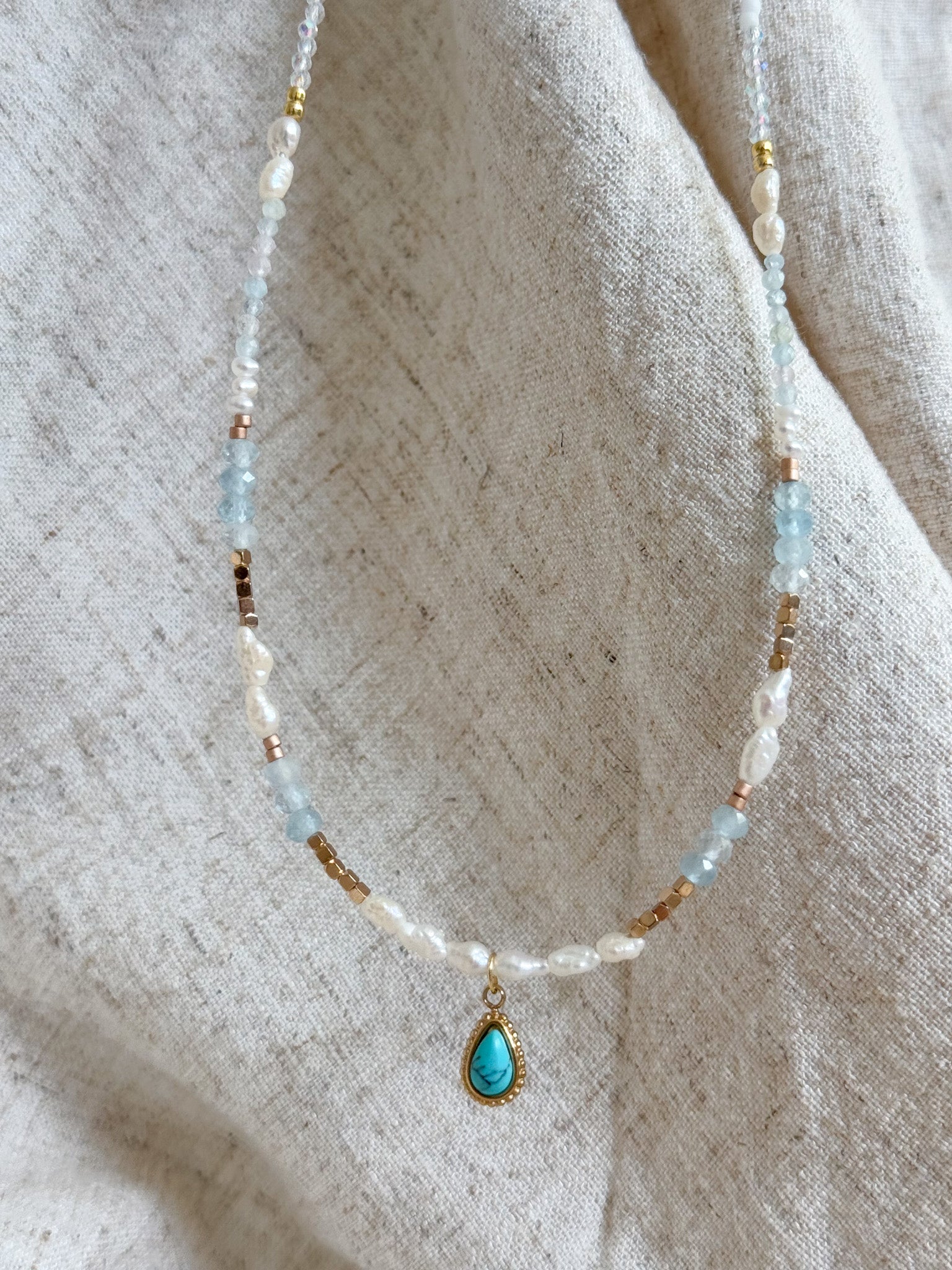 Materials: Natural baroque freshwater pearl, aquamarine, turquoise pendant and 18k gold-plated/stainless steel parts.
