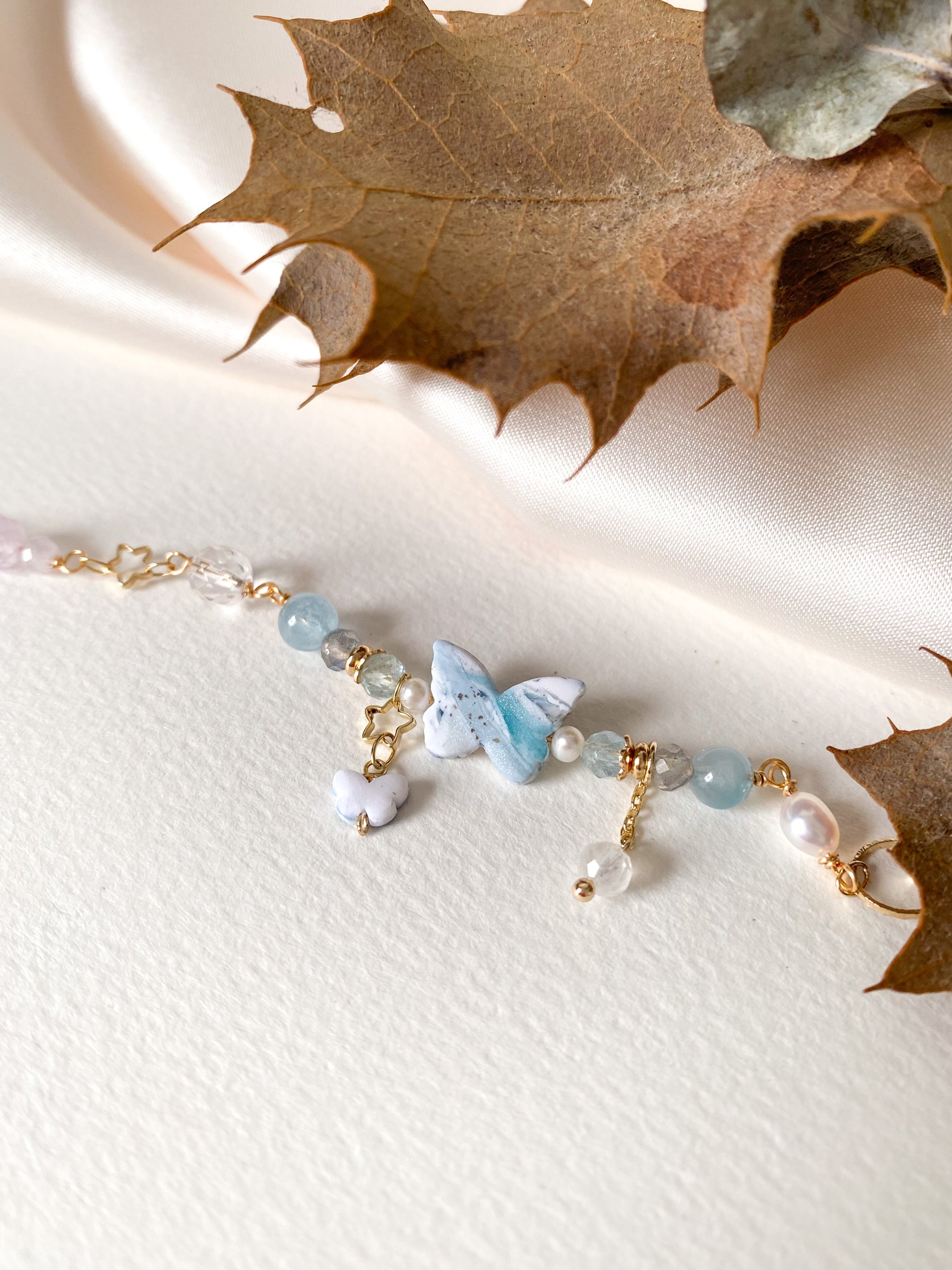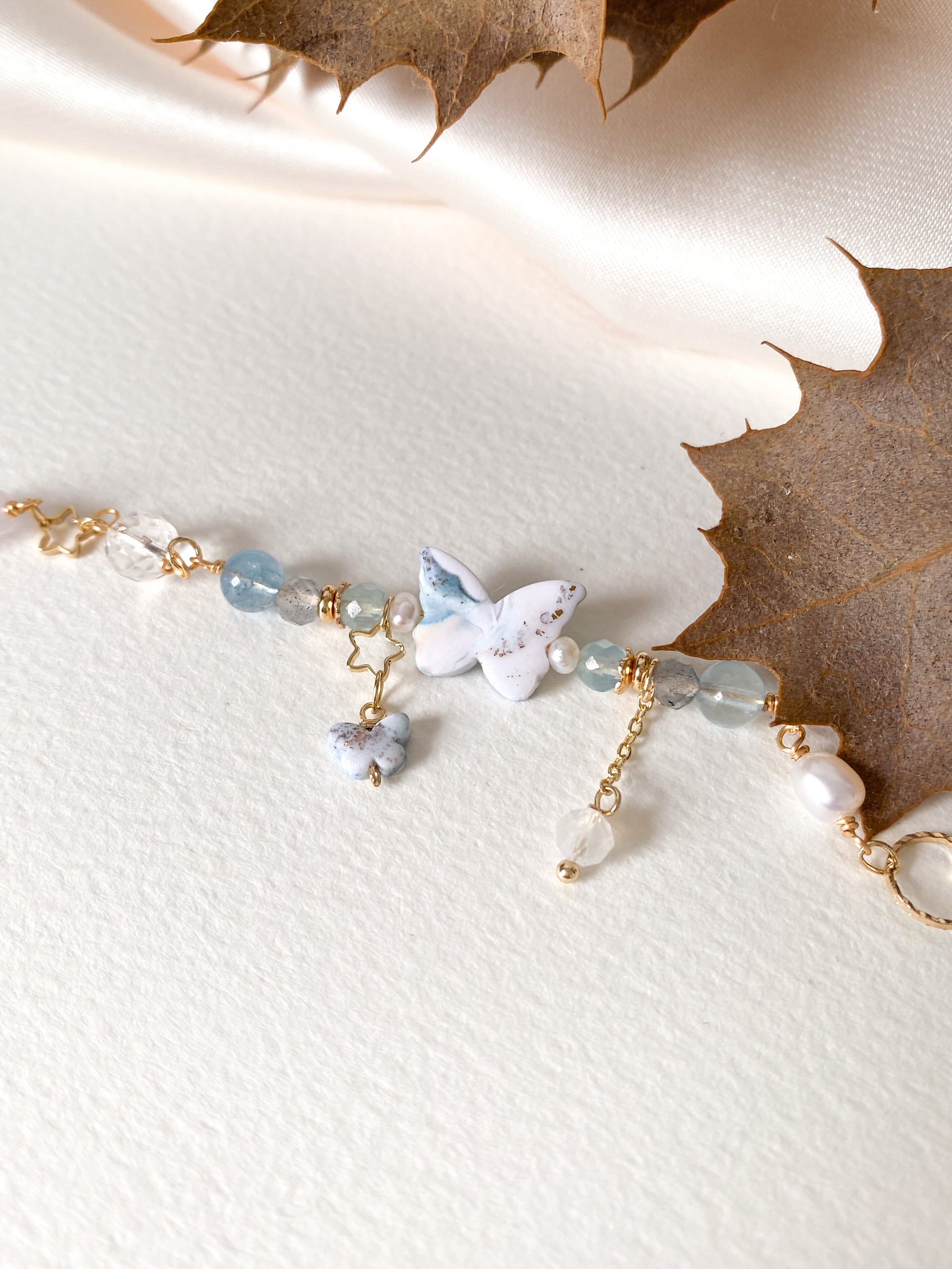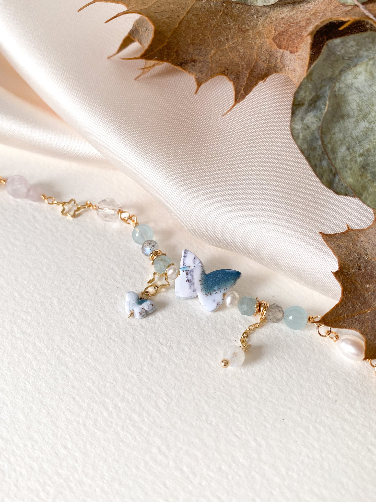 Material : Polymer clay butterfly charm, natural gemstones and 14k Gold Plated Chain, attached to spring ring clasp