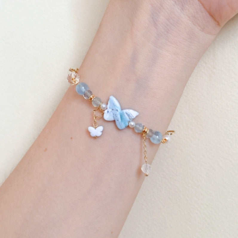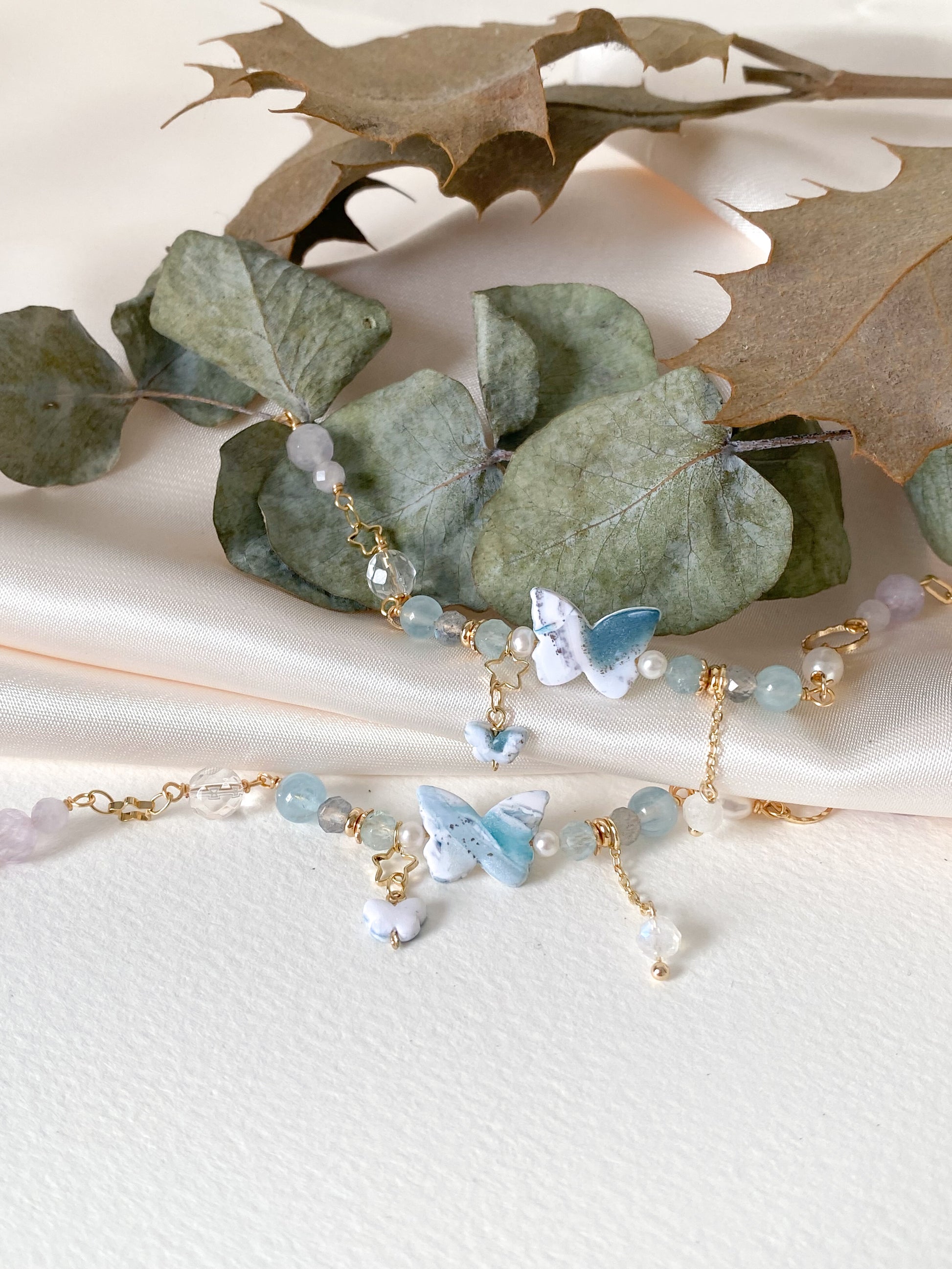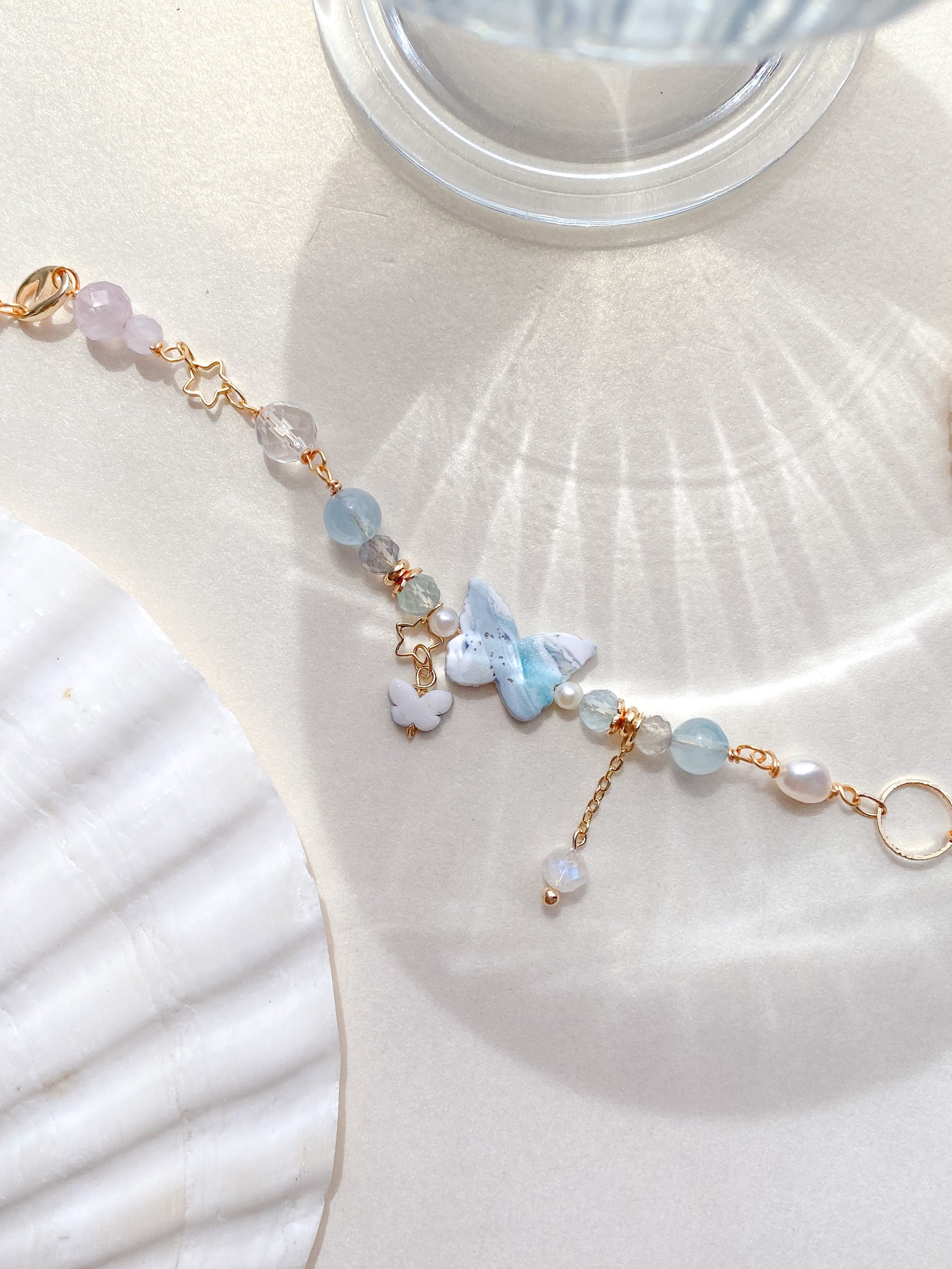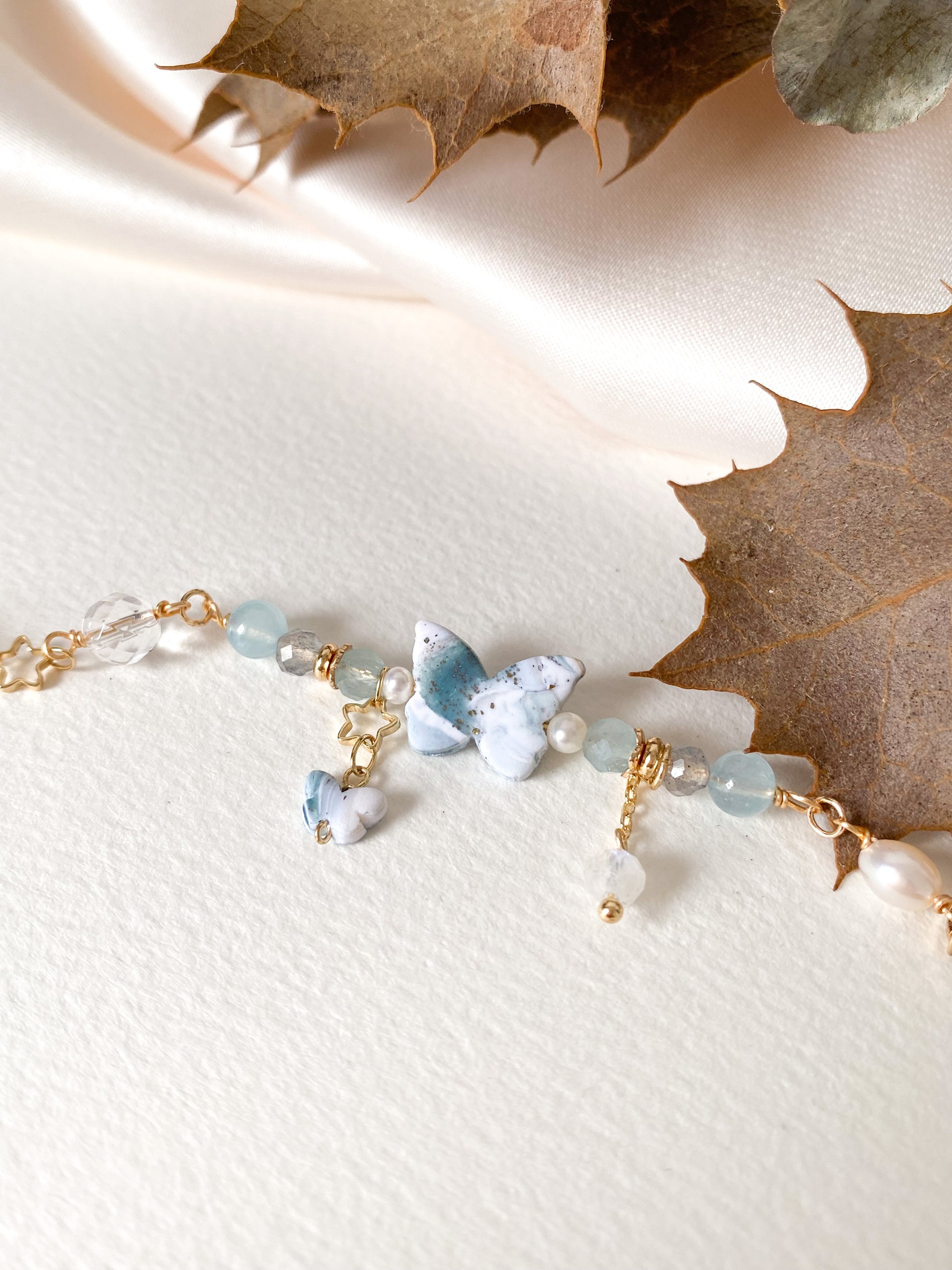 Material : Polymer clay butterfly charm, natural gemstones and 14k Gold Plated Chain, attached to spring ring clasp