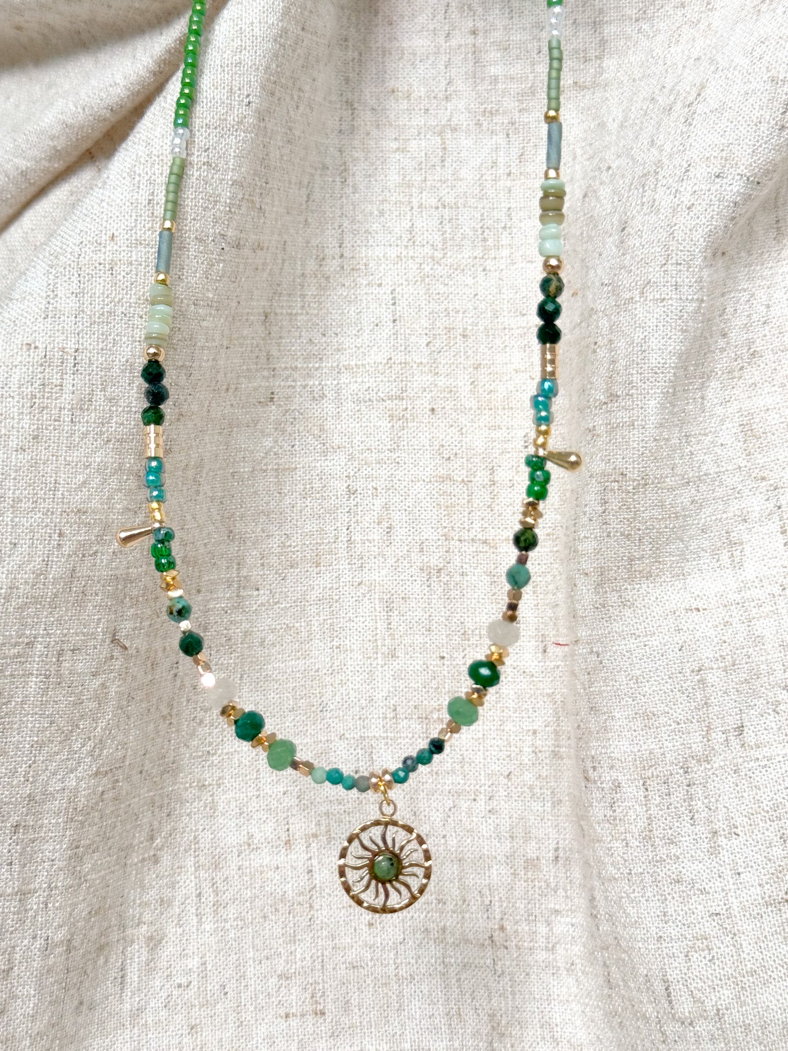 Materials: Natural Green Tourmaline, Green Mica Crystal, Turquiose, premium Japanese glass beads, and 18k gold-plated/stainless steel parts.