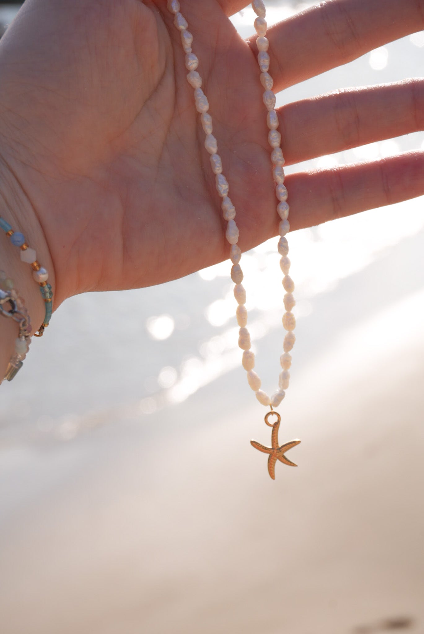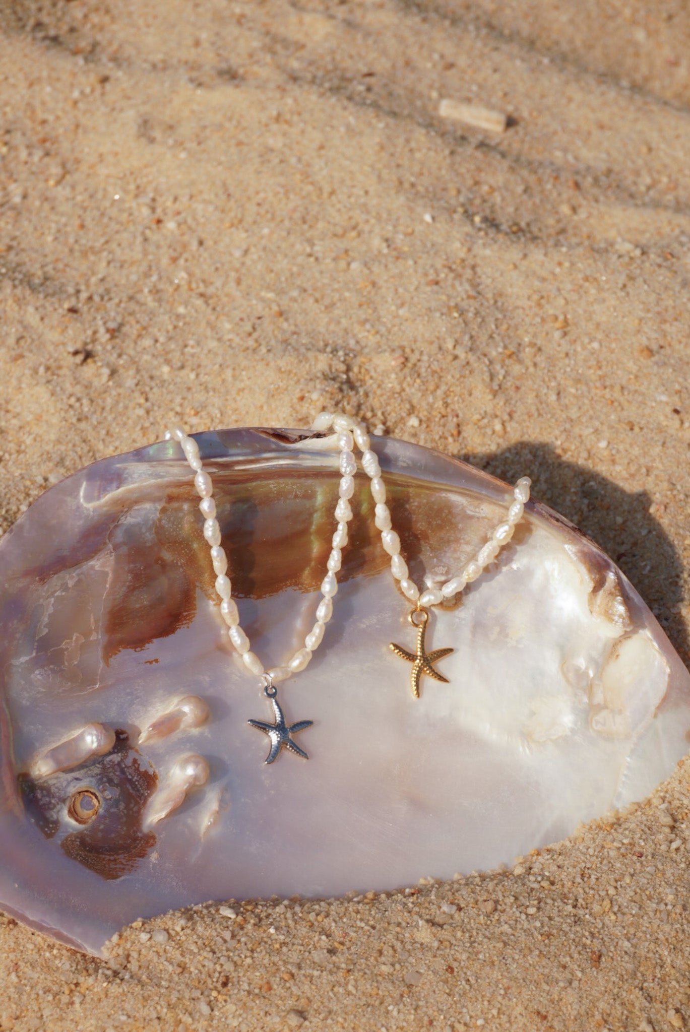 Made with freshwater baroque pearls, stainless steel starfish pendant and hardware.